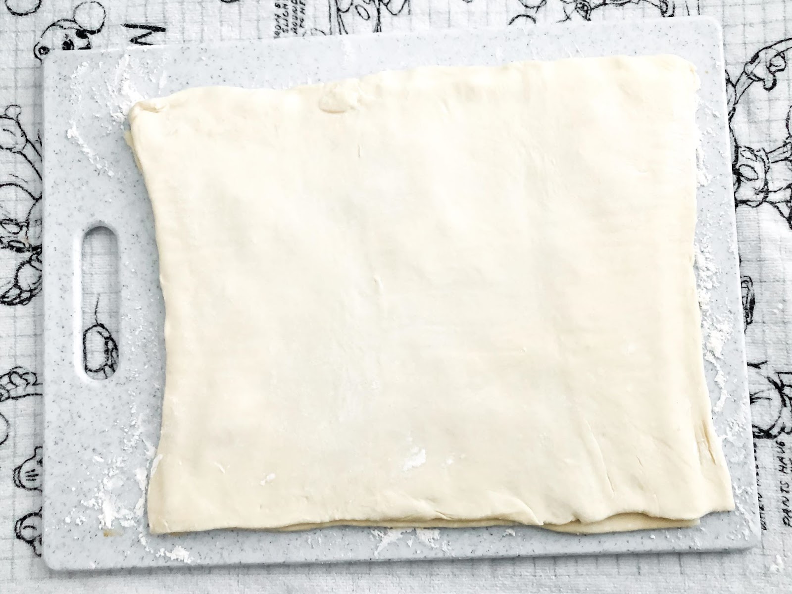 3) Place one sheet of puff pastry onto a lightly floured, movable, flat surface, such as a lightweight cutting board. Lightly dust surface of pastry with flour and roll to smooth creases.