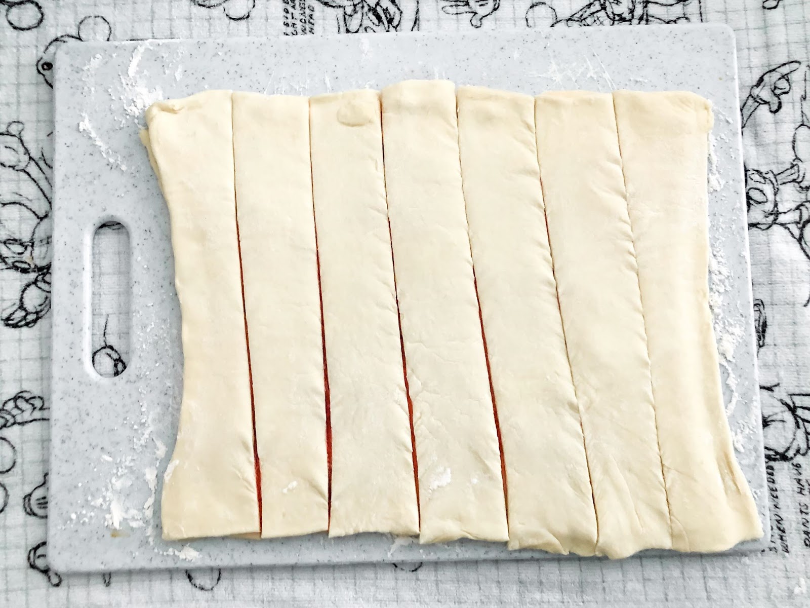 8) Using a ruler as a guide, cut into pastry into 1 1/2-inch strips. We simply eyeballed the cutting, but if you want your twists to be perfect, I would recommend measuring them out. Still, I don’t think we did too bad.
