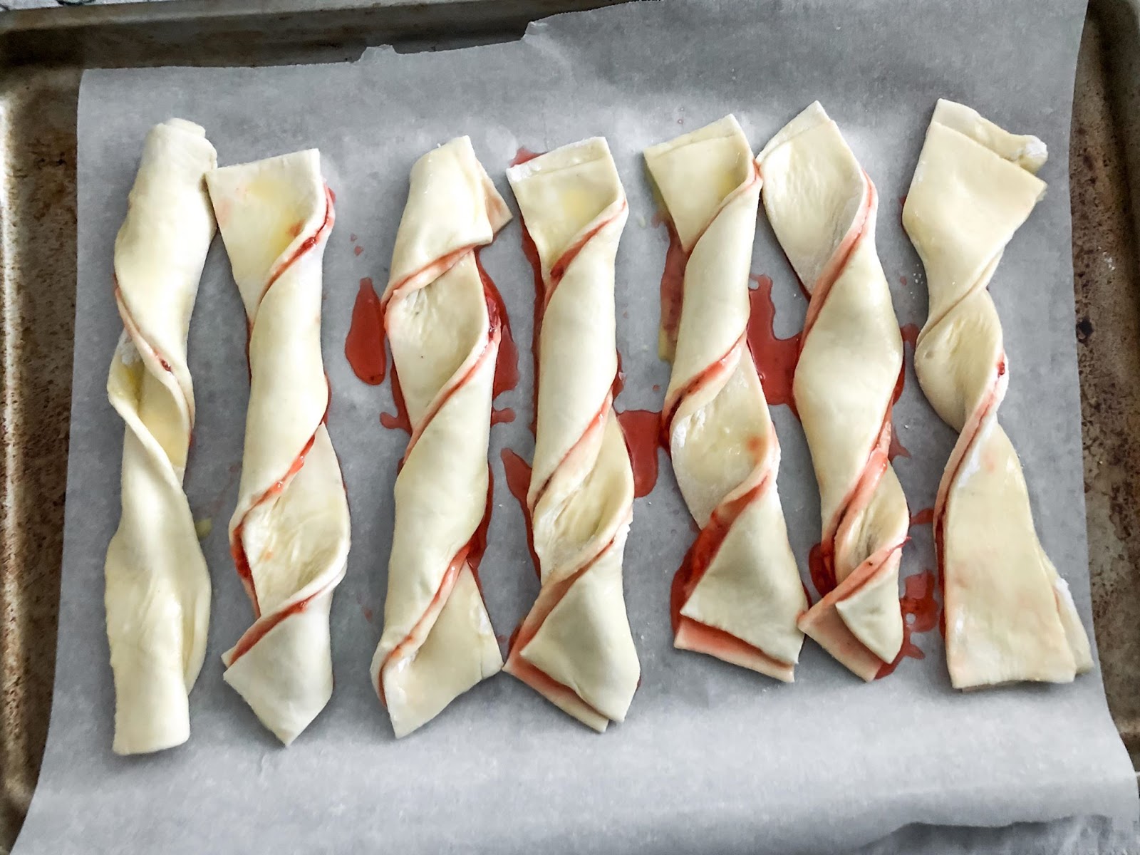 9) Carefully pick up strips and place on baking sheets, twisting 3 times before laying down.
