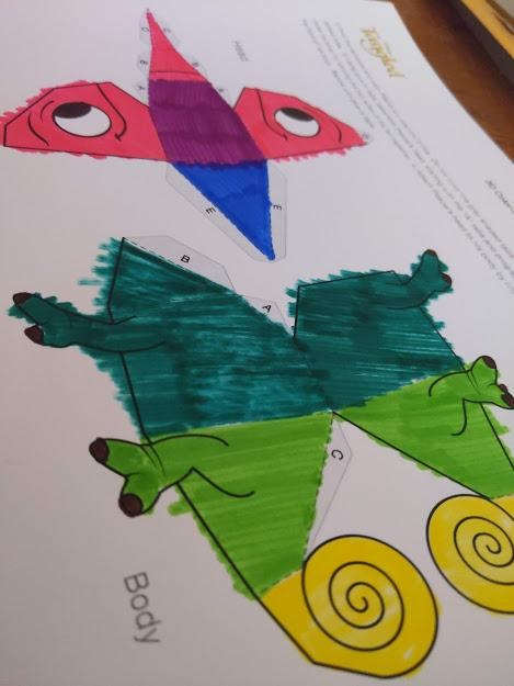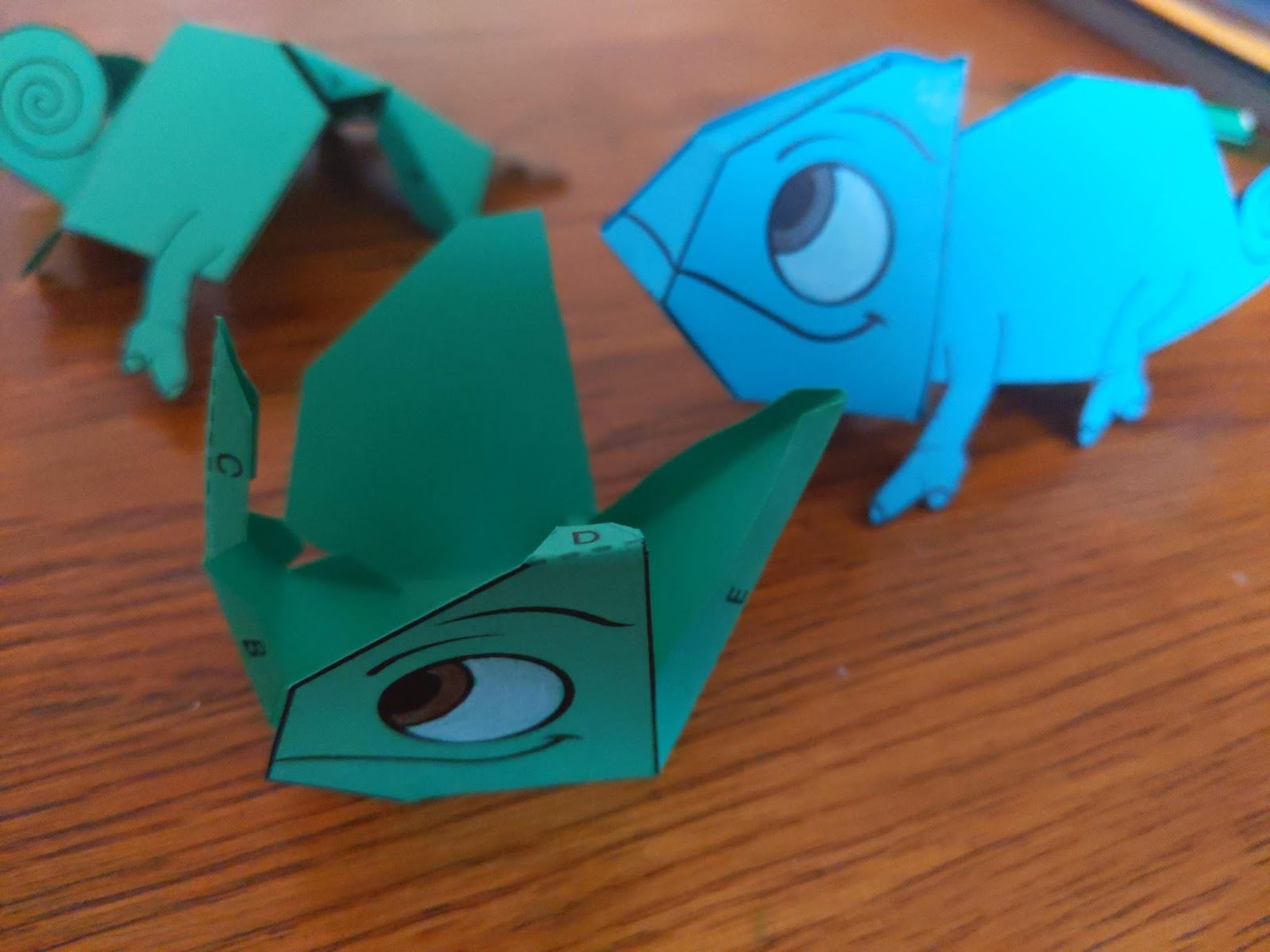 Folding and gluing the dimensional chameleon was a bit challenging due to the awkward shape. I used a clothespin to help hold portions as the glue set. And found it helpful to use a small plastic card like a gift card or ID to establish crisp folds for the figure’s tabs.