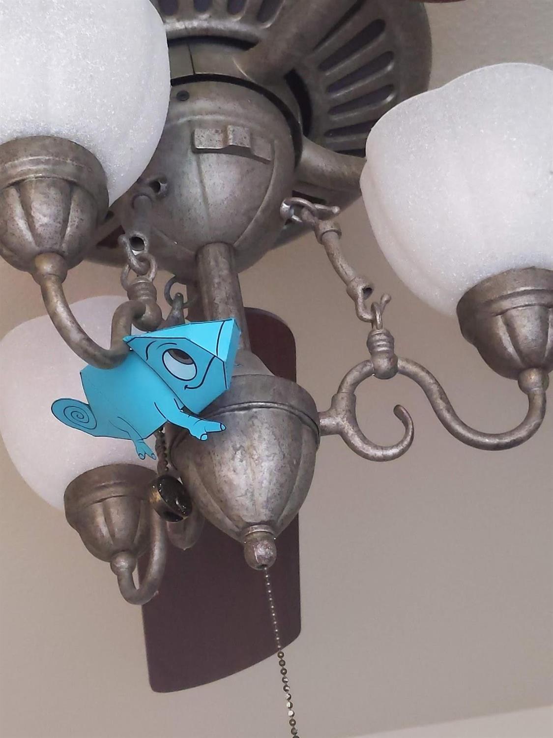 Once completed, Pascal hid on the ceiling fan and on the bookshelf.