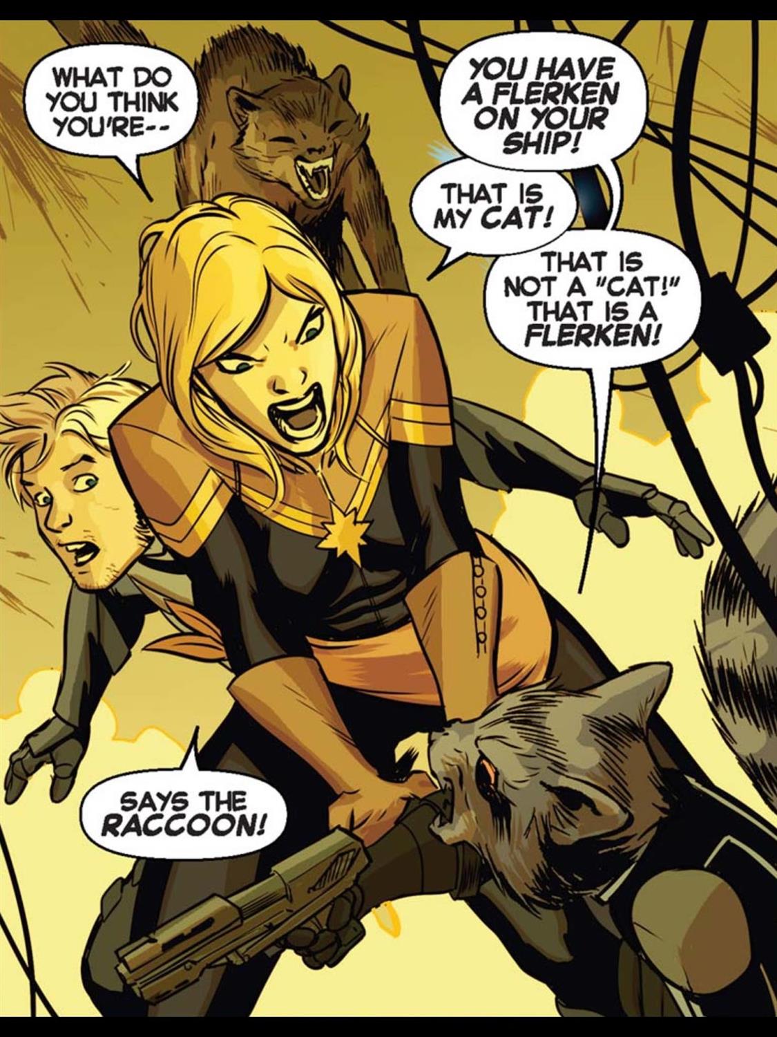 With that being said though, it is still a very interesting story and that lack of other characters really allows writer Kelly Sue DeConnick to zero in on Carol Danvers and let the readers get inside her head. Plus, it’s not like the story doesn’t feature at least a few familiar faces. The majority of the story deals with new characters, but as I mentioned earlier, the Guardians of the Galaxy do make an appearance, and Rocket is not a fan of Carol’s “cat” Chewie.