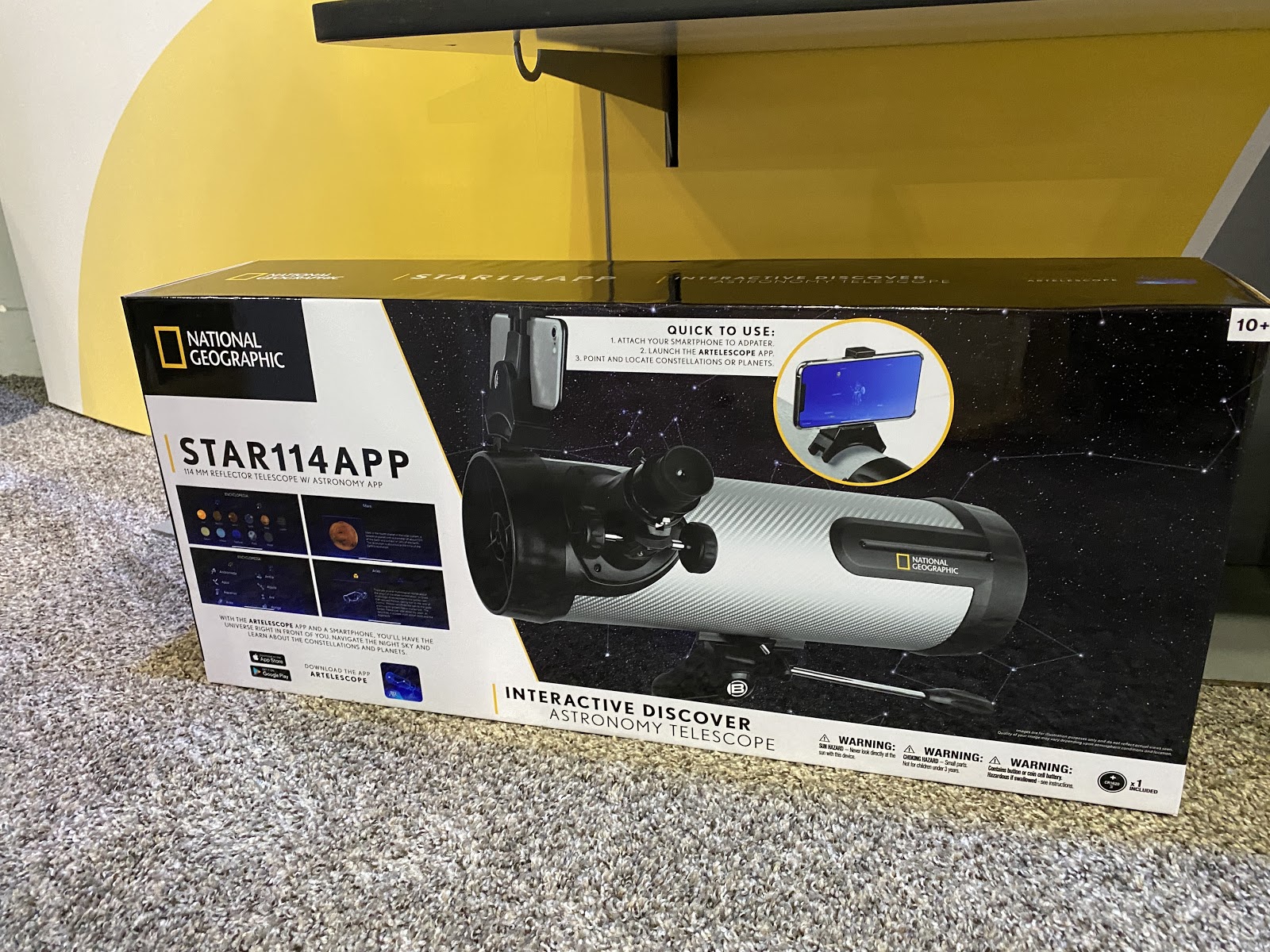 The National Geographic NT114CF 114mm Carbon Fiber Reflector Telescope has a 114mm aperture and a 500mm focal length. Two Plossl eyepieces produce images with excellent definition and contrast. It comes with an adjustable tripod, a red dot viewfinder, a Smartphone Camera Adapter, and a smartphone app.