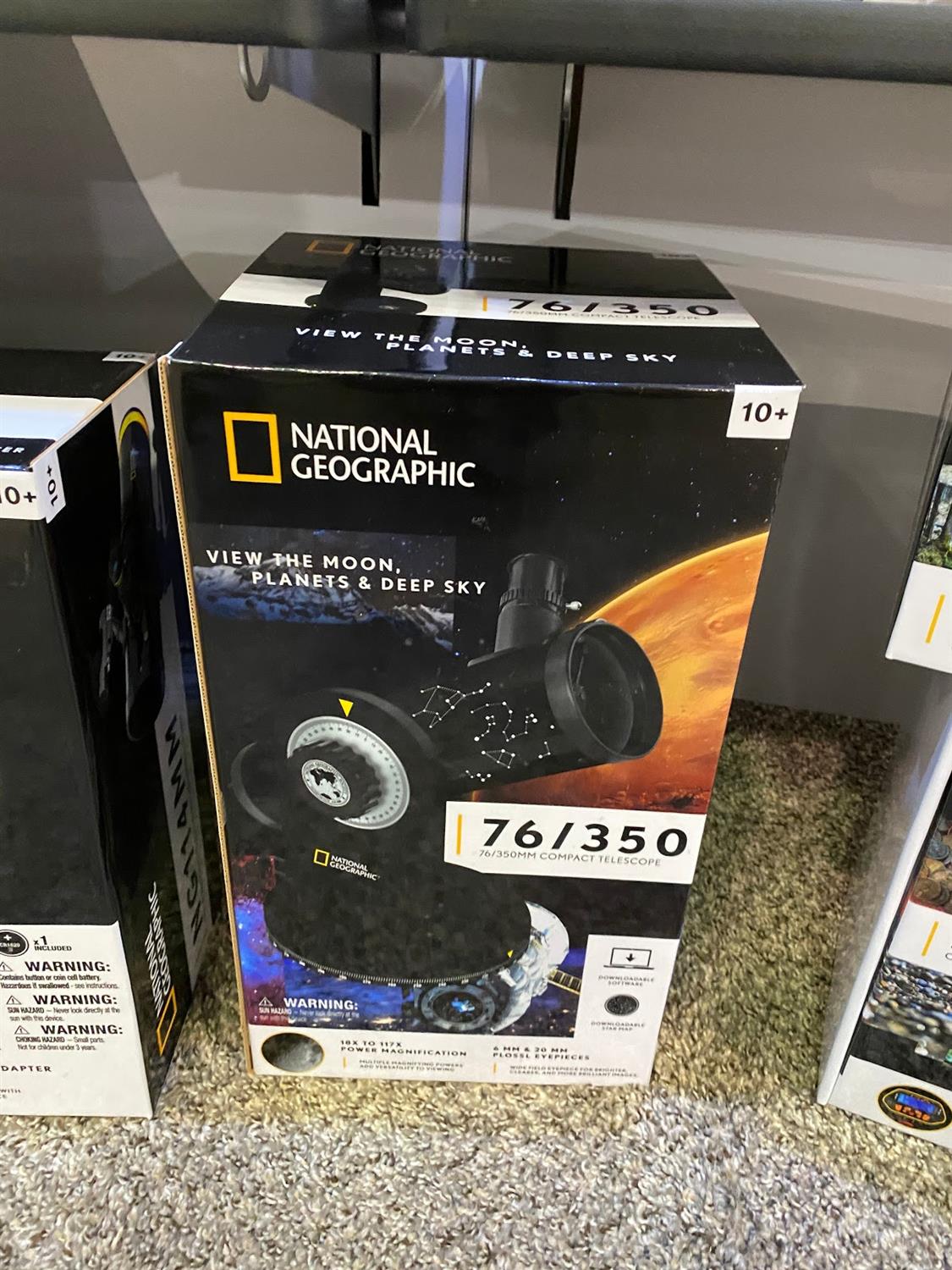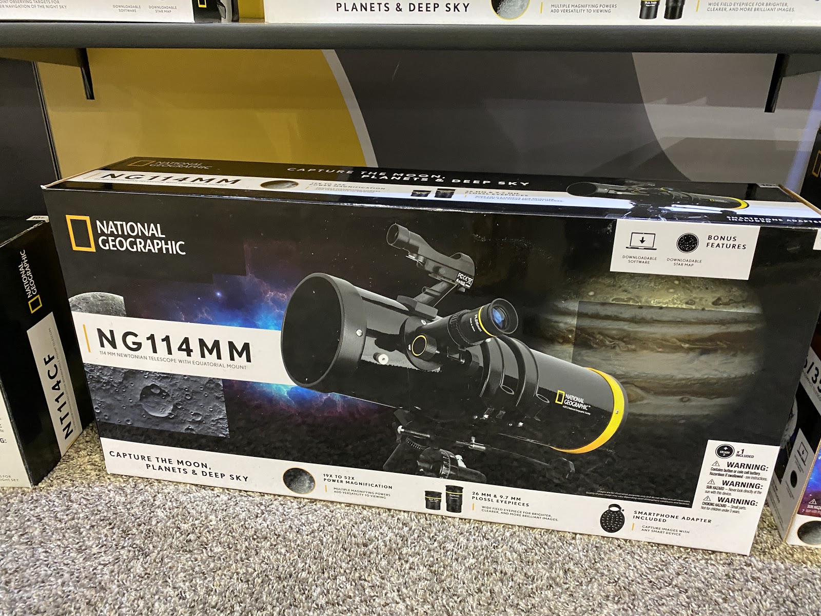 The top of the line item in the collection is the National Geographic NG114mm Newtonian Telescope w/ Equatorial Mount. It includes an equatorial mount with slow motion controls for easier planetary navigation and a fast focal ratio for better photography.