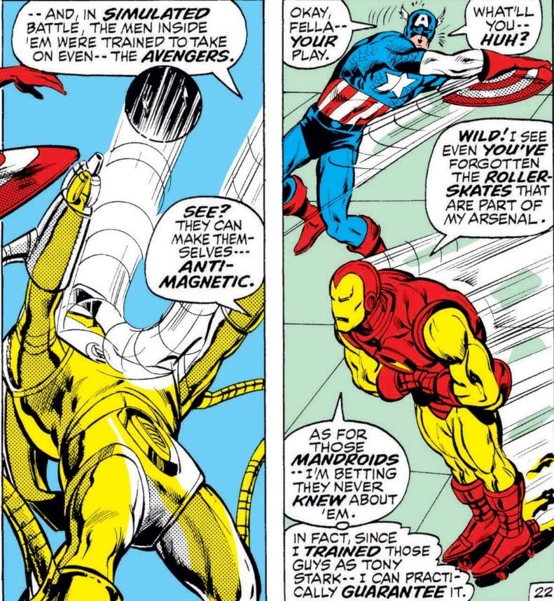 It’s also packed with all kinds of classic 70s comic book fun. You know, the most ridiculous things you could possibly think of being thrown into a comic somehow manage to find there way in there. Want a caveman Hanky Pym? He’s in there. Want a group of guys in armored suits called the “Mandroids?” You got it. Want to see Iron Man with built-in roller skates? Believe it or not, you get that too.