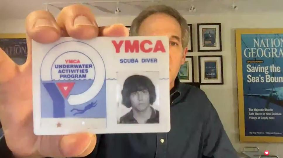 Growing up in Massachusetts, he was inspired as a child by Jacques Cousteau and National Geographic, imagining himself as an ocean explorer in his backyard pool. He became a certified scuba diver in 1977 at his local YMCA and he showed off his original diver card. On his first certification dive in a stone quarry, he found a silver half dollar that has become his lucky charm, accompanying him on every trip he takes.