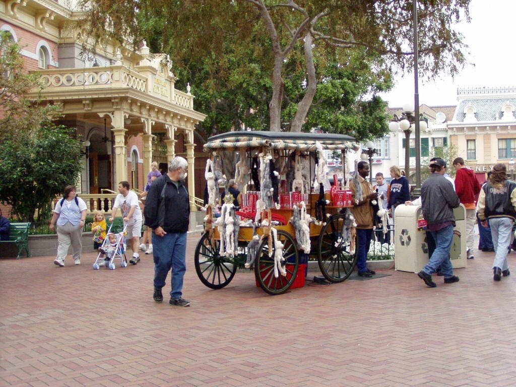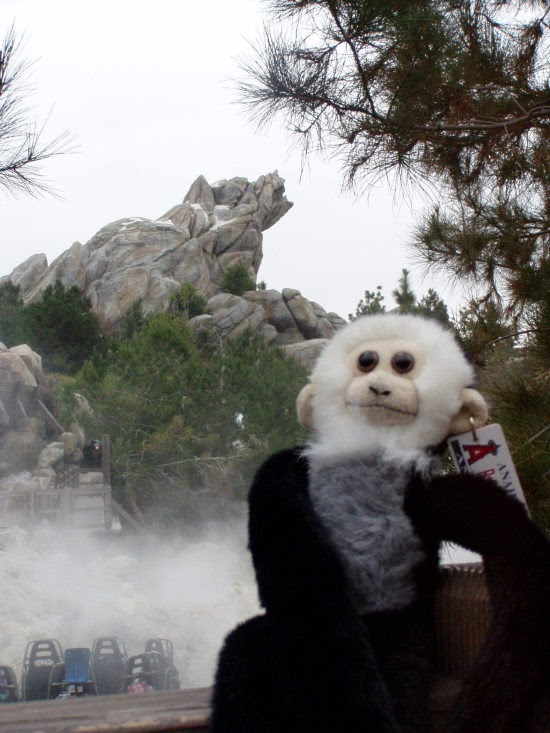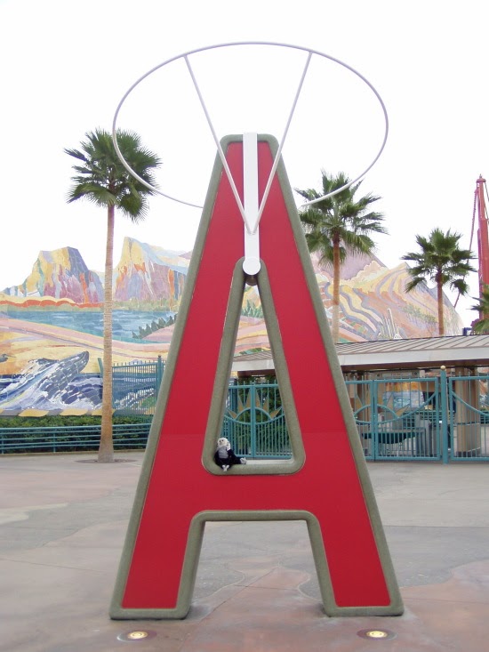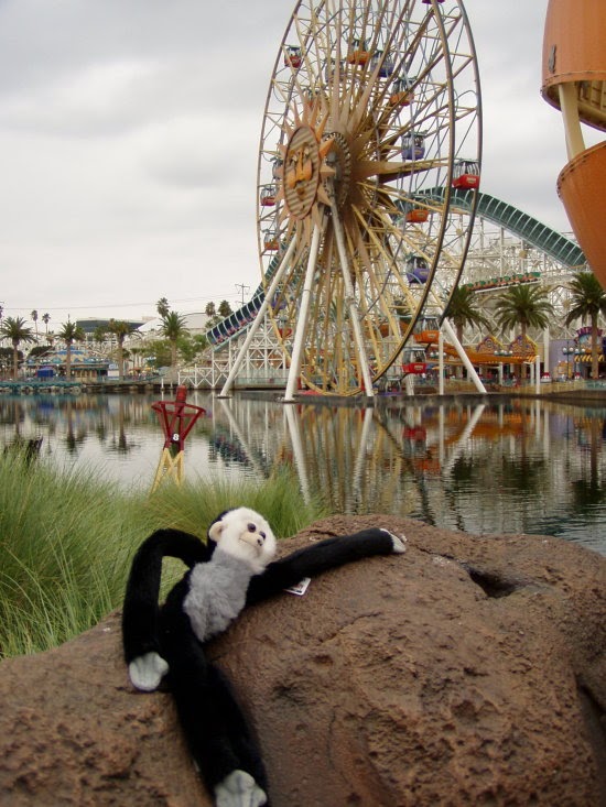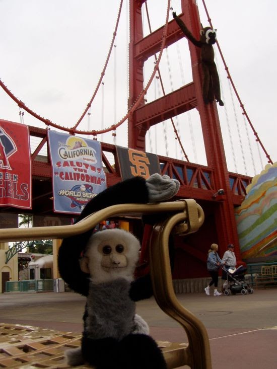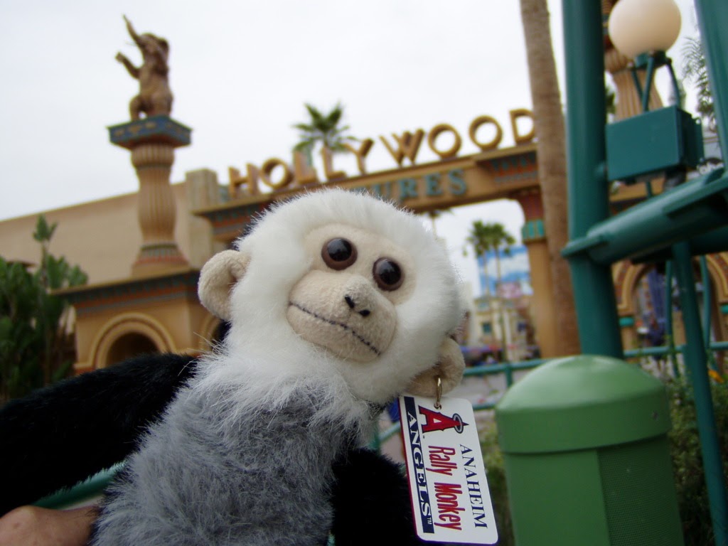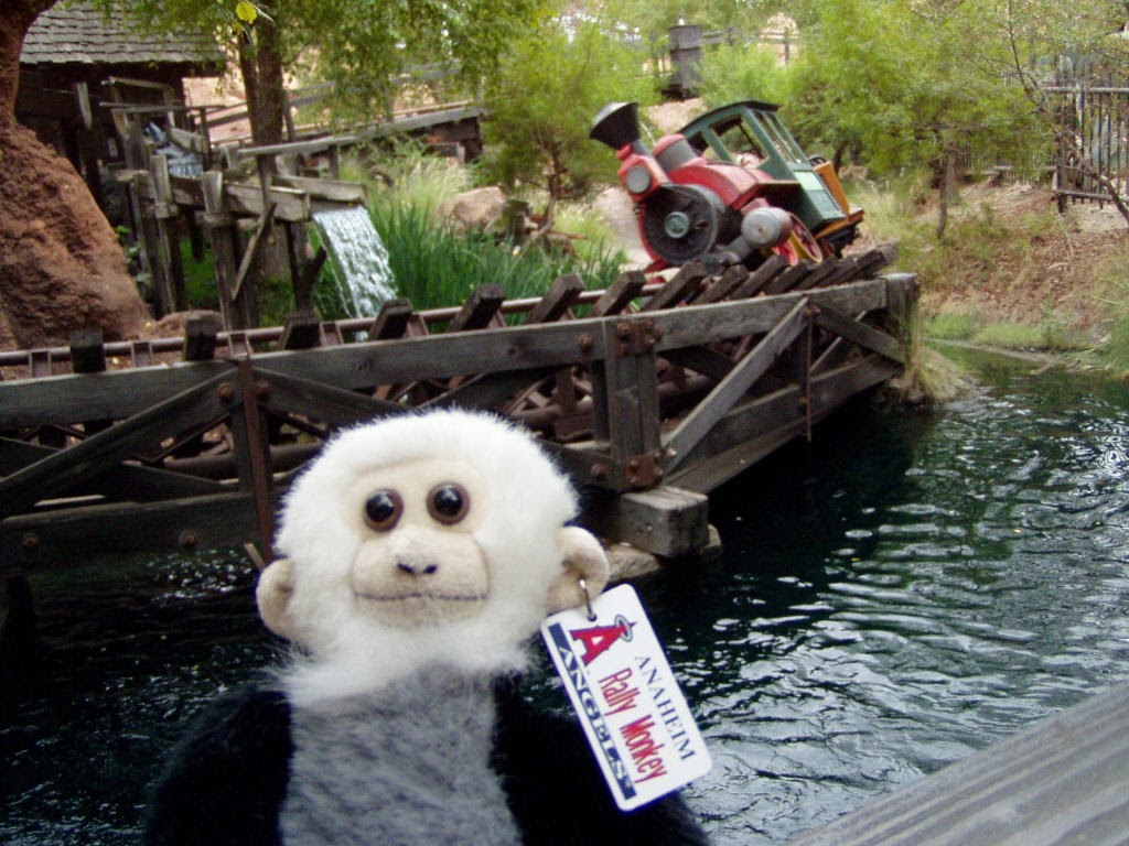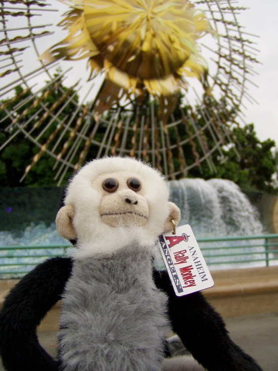 Rebekah's rally monkey takes a break before Game 3. The Anaheim Angels have rallied from behind to win about 50 games this season. When the Angels' are in a position to rally, the scoreboard shows a small capuchin monkey called the Rally Monkey. The little critter has become a fan favorite. In celebration of the Angels first World Series appearance and hopefully to bring them that win we took the rally monkey throughout today's Disneyland Resort to gather up a bit more magic for the Series.