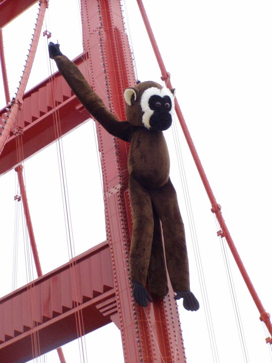 An oversized Rally Monkey hangs from the Northern California landmark