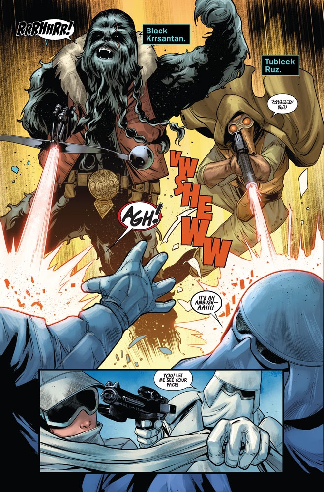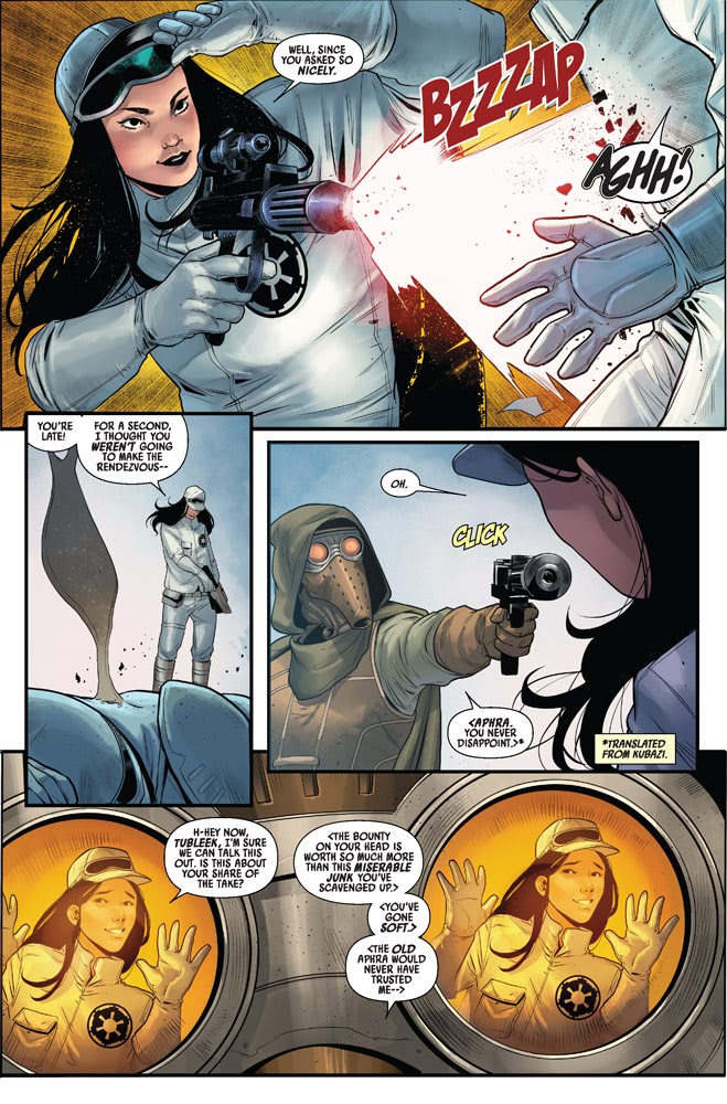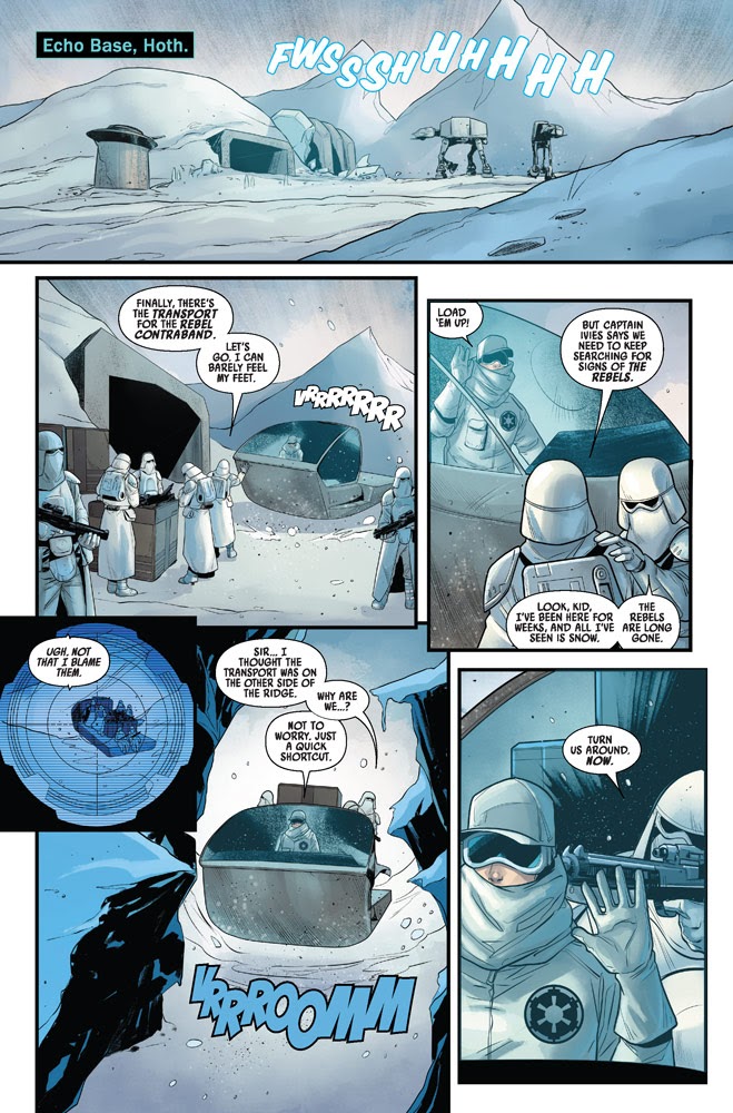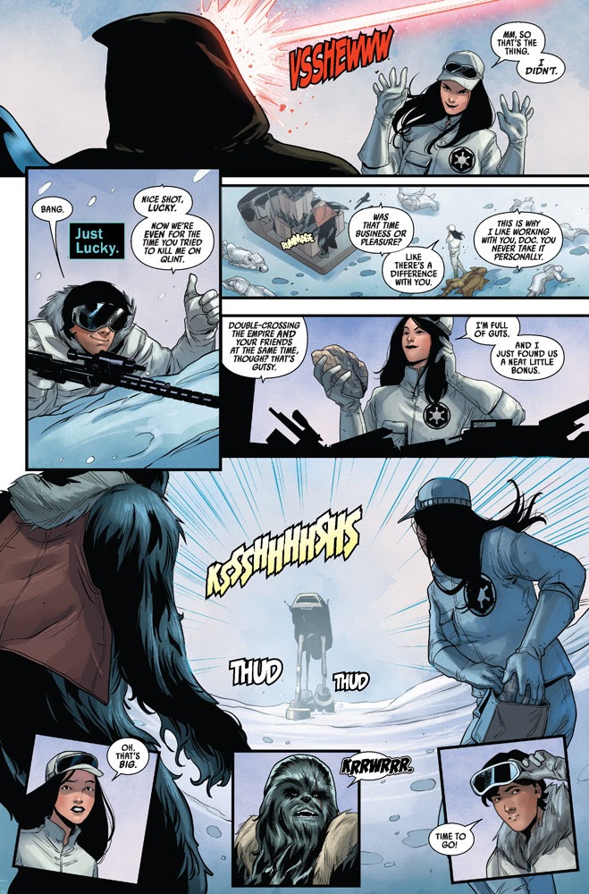 This first issue of the newly renumbered Star Wars: Doctor Aphra title does actually begin with a quick sojourn to familiar territory, as she runs a quick scam on the Snowtroopers sifting through the rubble of Echo Base on Hoth with the help of her old Wookiee pal Black Krrsantan (the only other previously recognizable character to appear in this installment) and the beginnings of a new crew she’s putting together. We also meet ambitious archaeology student Detta Yao, Aphra’s rivalrous former classmate Professor Eustachia Okka, assistant droid TA-418, handy sniper Just Lucky, and new antagonist Ronen Tagge-- a ruthless aristocrat and young relative of Imperial Army Chief Cassio Tagge.