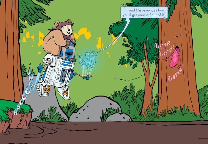Star Wars: R2-D2 is Lost! sees the three lovable droid companions C-3PO, R2-D2, and BB-8 returning to the forest moon of Endor and reuniting with their diminutive Ewok friends. The Ewoks immediately recognize Threepio as the golden god they once worshipped and bring him back to their village on his wooden throne, but Artoo is having none of it and wanders off into the woods alone.