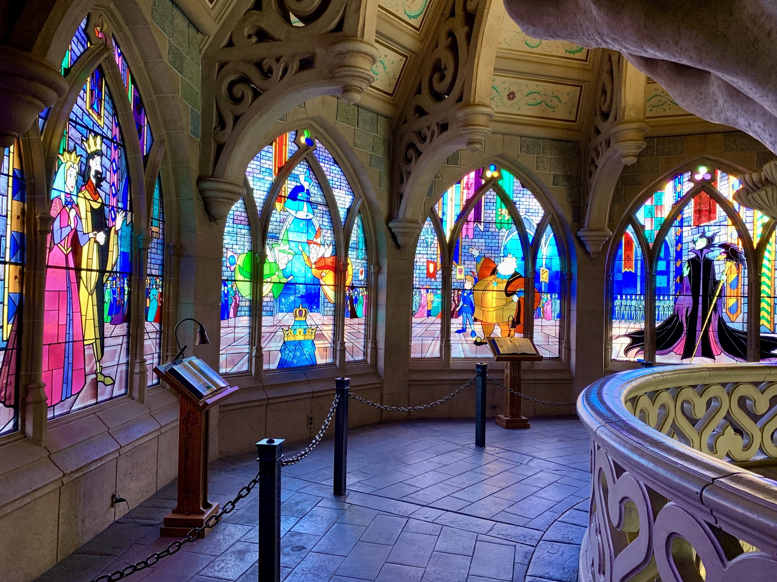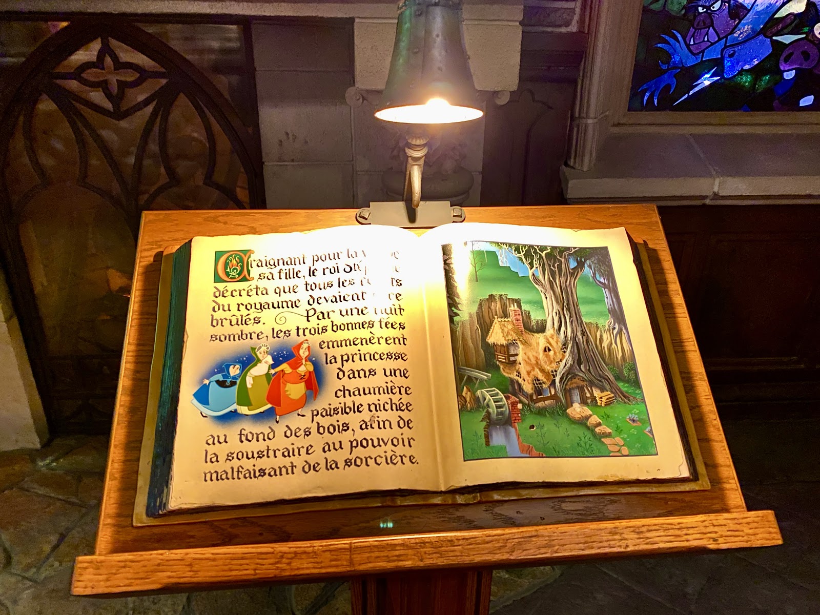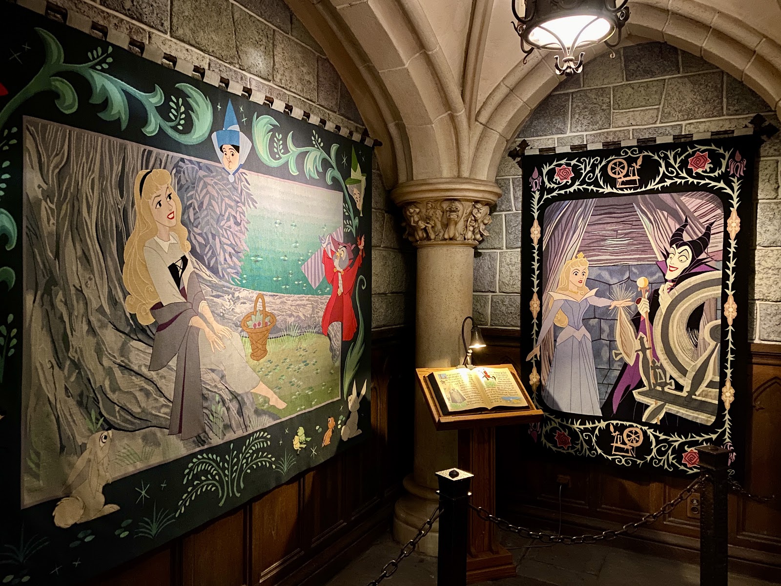In the tradition of the original Sleeping Beauty Castle in Disneyland, there is a La Galerie de la Belle au Bois Dormant. This walkthrough retells the story Princess Aurora, the three fairies (Flora, Fauna, and Merryweather), and of course the Queen of Evil Maleficent through stained glass, tapestries, and story books. It also concludes with some of the best views of the park you could ever dream of.