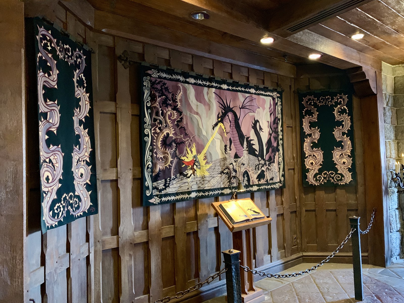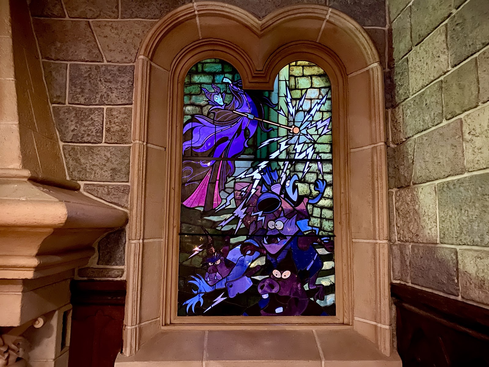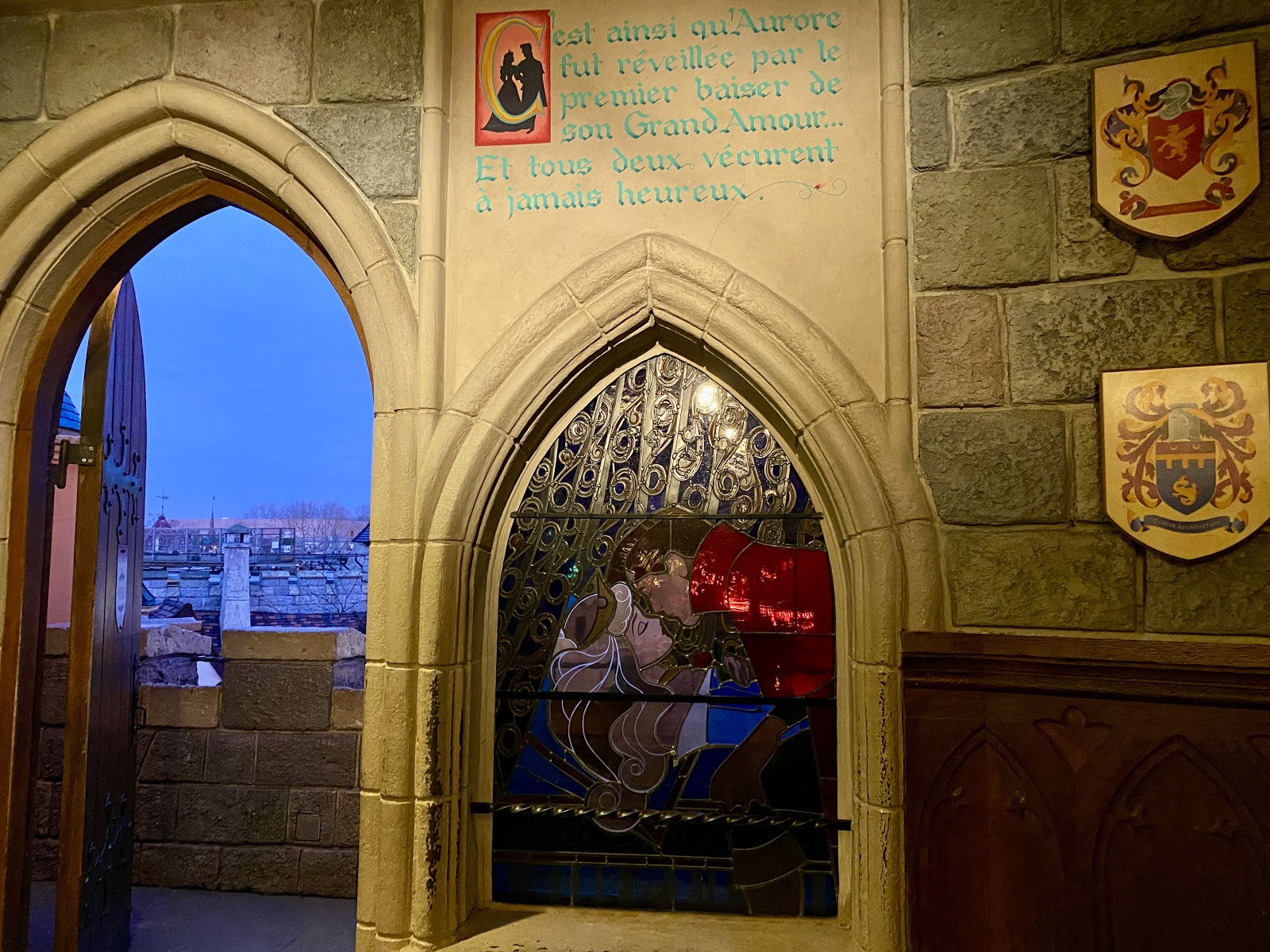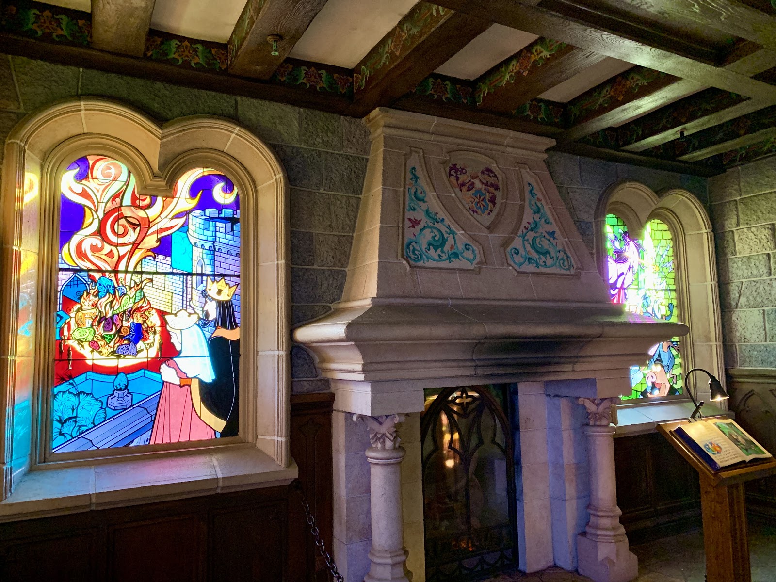 In the tradition of the original Sleeping Beauty Castle in Disneyland, there is a La Galerie de la Belle au Bois Dormant. This walkthrough retells the story Princess Aurora, the three fairies (Flora, Fauna, and Merryweather), and of course the Queen of Evil Maleficent through stained glass, tapestries, and story books. It also concludes with some of the best views of the park you could ever dream of.