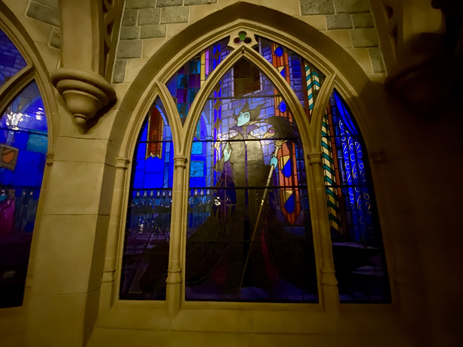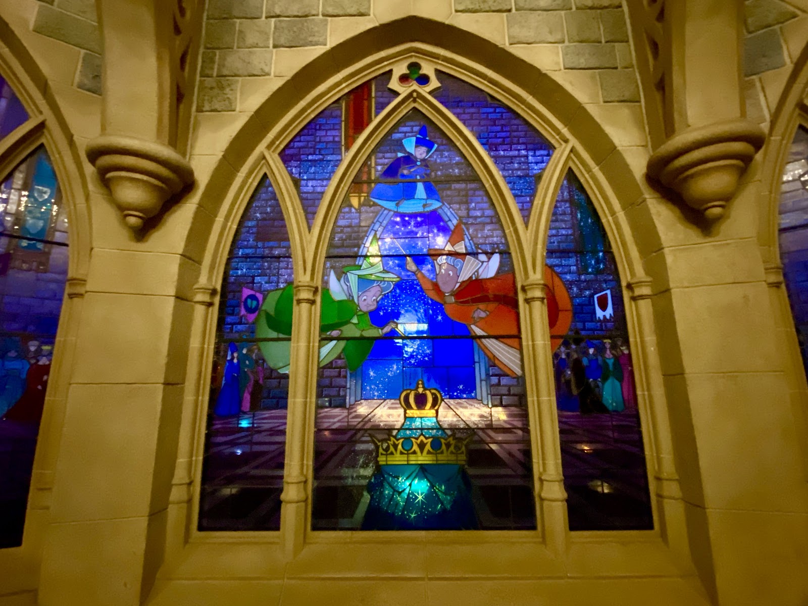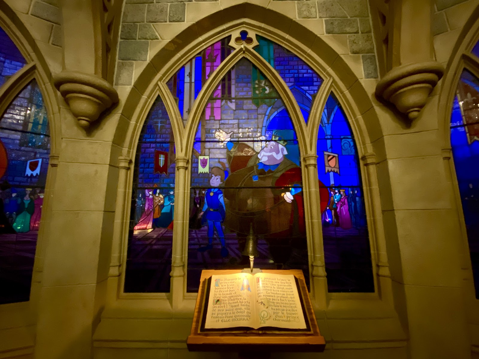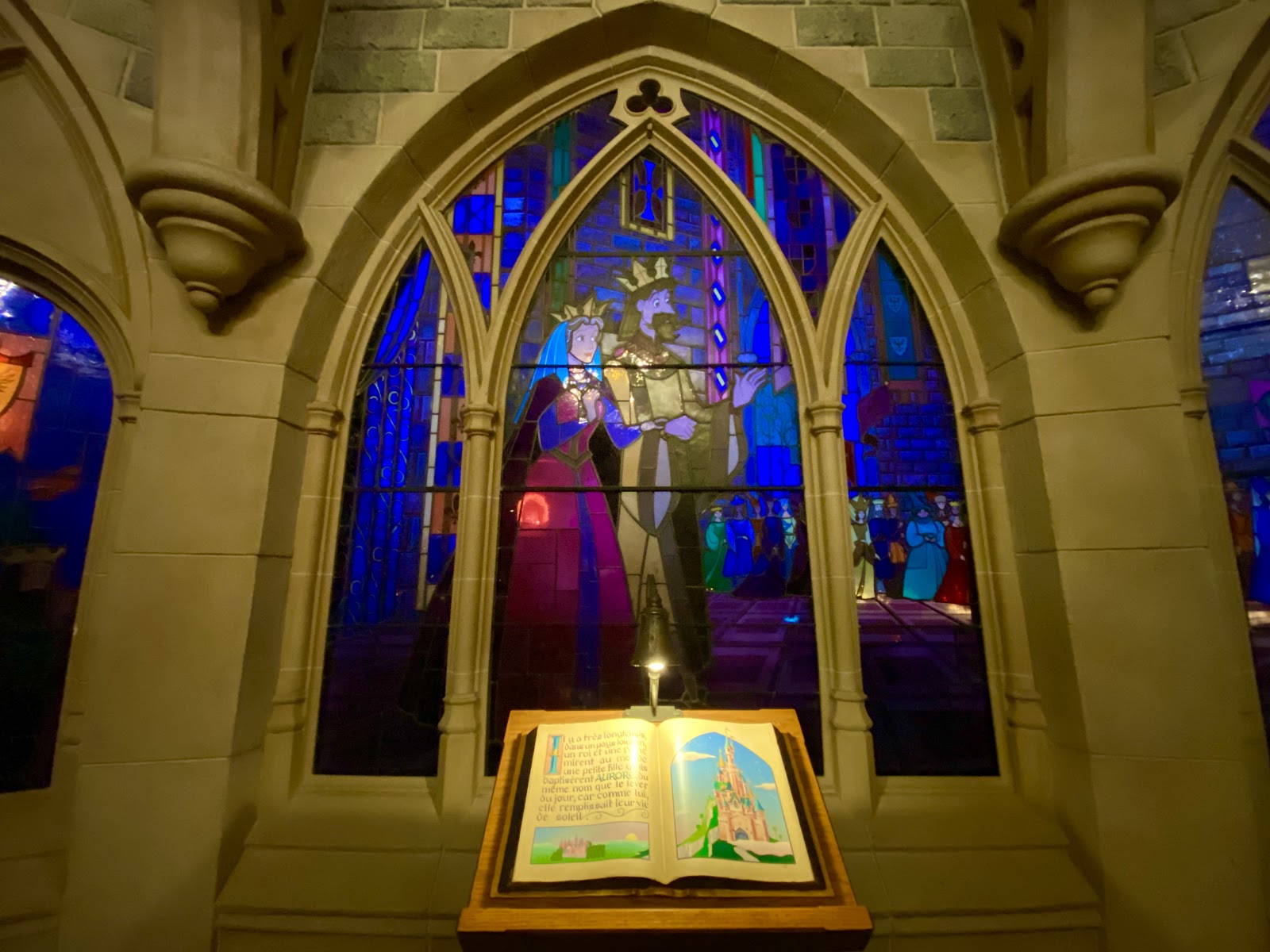 In the tradition of the original Sleeping Beauty Castle in Disneyland, there is a La Galerie de la Belle au Bois Dormant. This walkthrough retells the story Princess Aurora, the three fairies (Flora, Fauna, and Merryweather), and of course the Queen of Evil Maleficent through stained glass, tapestries, and story books. It also concludes with some of the best views of the park you could ever dream of.