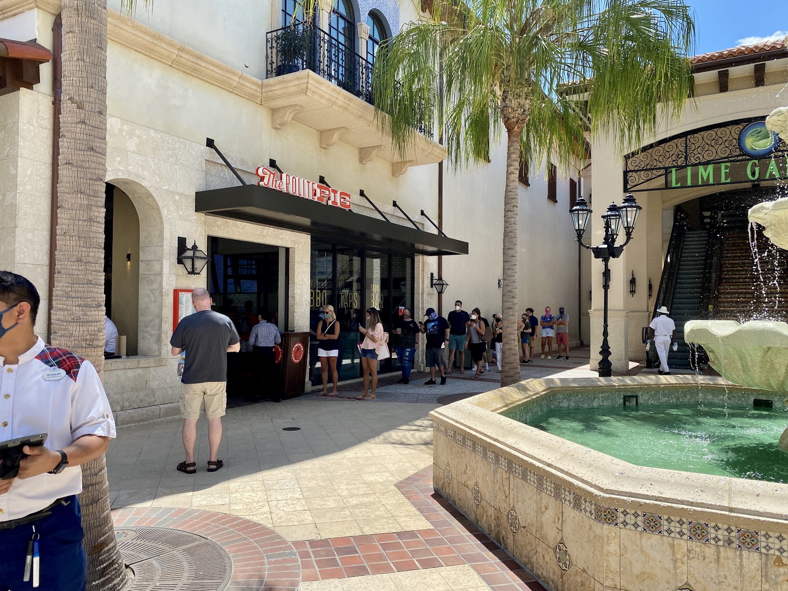With this being just the first day of reopening, I am sure a lot of the concepts that the Disney Springs team had in place will evolve time and time again. Still, seeing the Springs return to life was a smooth operation indeed. Locations like Chicken Guy and Polite Pig had spacing locators already set but, as those locations became more busy, management was on hand to measure out more 6 foot intervals for guests.