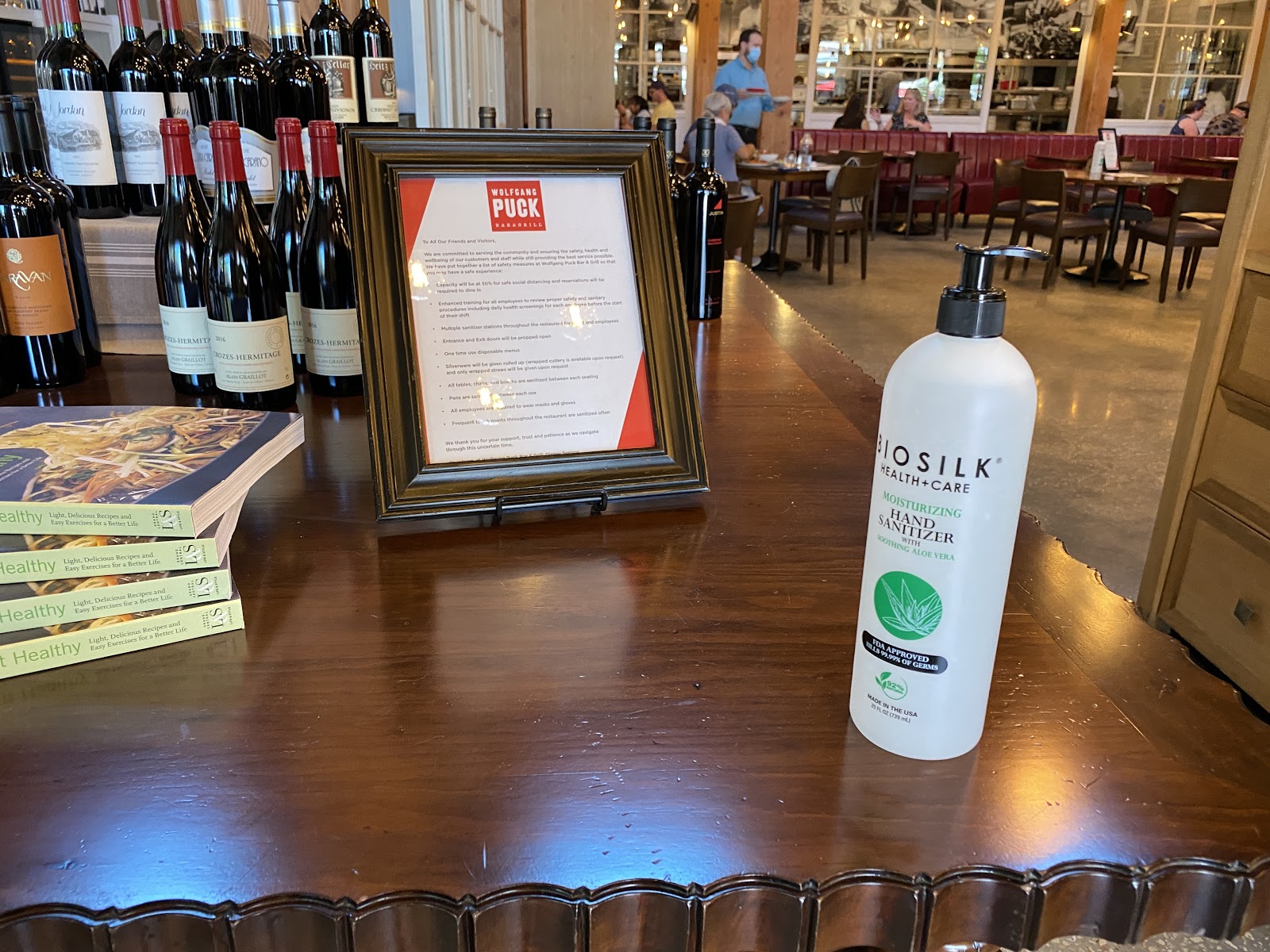 Dining at Wolfgang Puck Bar & Grill was also an interesting experience as, with this being their first day, some things were being handled “on the fly” (as one server put it) to try and best accommodate guests. First, from the check in station outside to the point you enter the building, sanitizer stations were available.