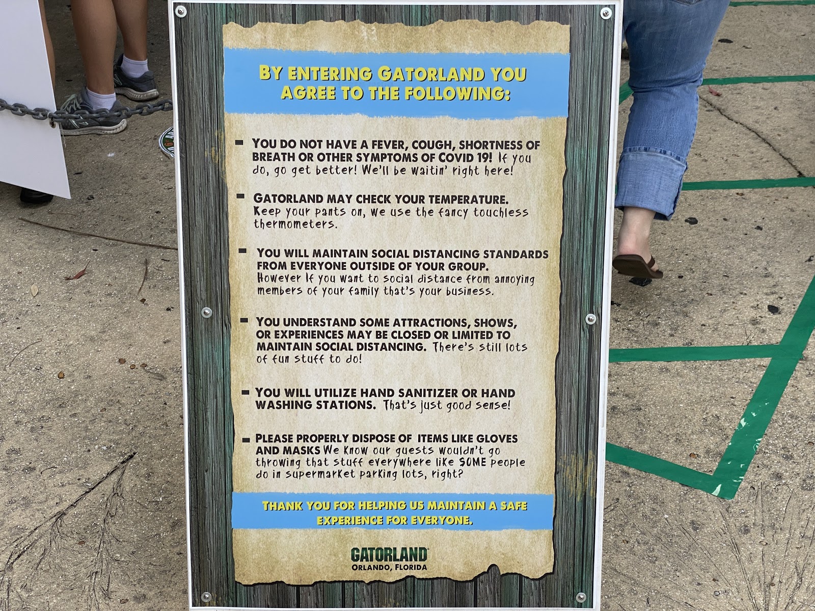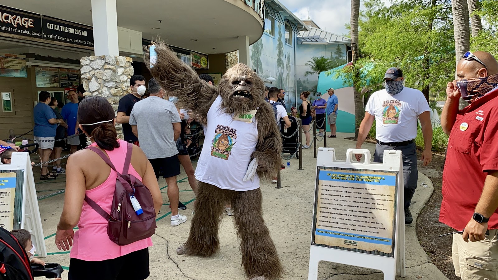 Gatorland has been a staple of Central Florida since before the days of Walt Disney World. So it seems almost fitting that it should be the first major tourist attraction in the area to reopen. The park has never taken itself too seriously, so in the days leading up to the reopening, a barrage of social media posts regarding the mythical Social Distancing Skunk Ape were seen on their website Gatorland.com. Thus, when he came out to welcome first day visitors, he was met with great joy!