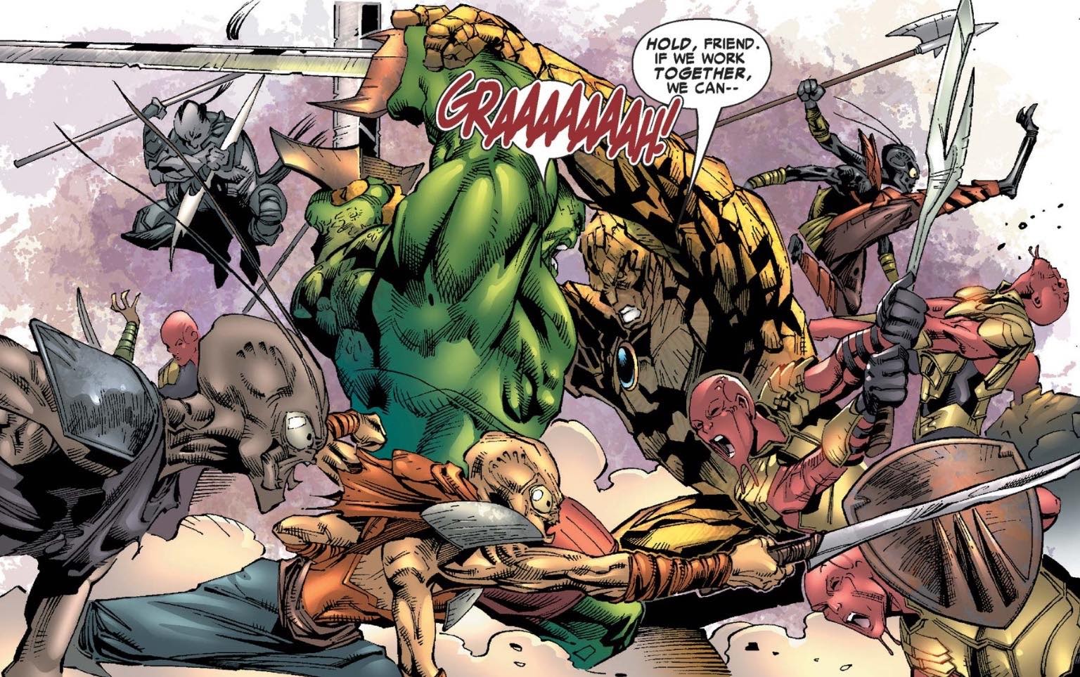 Aside from the names of some of the locations, it is very easy to forget that this story takes place on an alien planet and not Earth. It’s really a simple story of a hero leading an army to overthrow a powerful dictator. The planet on which the story occurs hardly affects the way in which it plays out. Plus, there are a lot of new fun things for Hulk to smash on this planet.