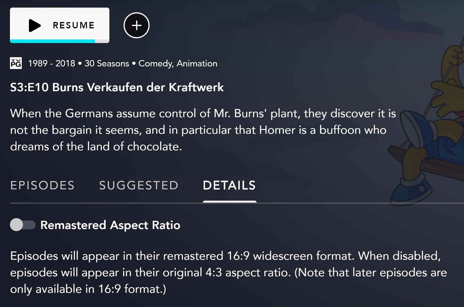 As noted, once you’ve done this, “episodes will appear in their original 4:3 aspect ratio.” Should you choose to turn the toggle switch back on, “episodes will appear in their remastered 16:9 widescreen format” (altered from the way they were originally produced and aired in order to fit the shape of modern high-definition television sets). Beginning with season 20, The Simpsons began airing in 16:9 HD, so the issue doesn’t apply to any episodes beyond that point.