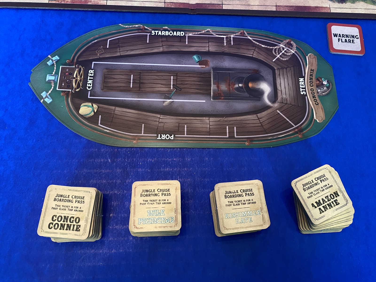 Players start by choosing from one of four different boats, which will be their pawn and help them keep track of their crew and cargo. The boats take their names from the multiple versions of the attraction with Amazon Annie, Congo Connie, Nile Princess, and Kissimmee Kate represented by the colors blue, green, yellow, and red. Players grab the crew tiles that correspond to their selected boat and distribute them on the boat’s four quadrants, which become important when you start drawing Navigation Cards. The quadrants are port, starboard, center, and stern.