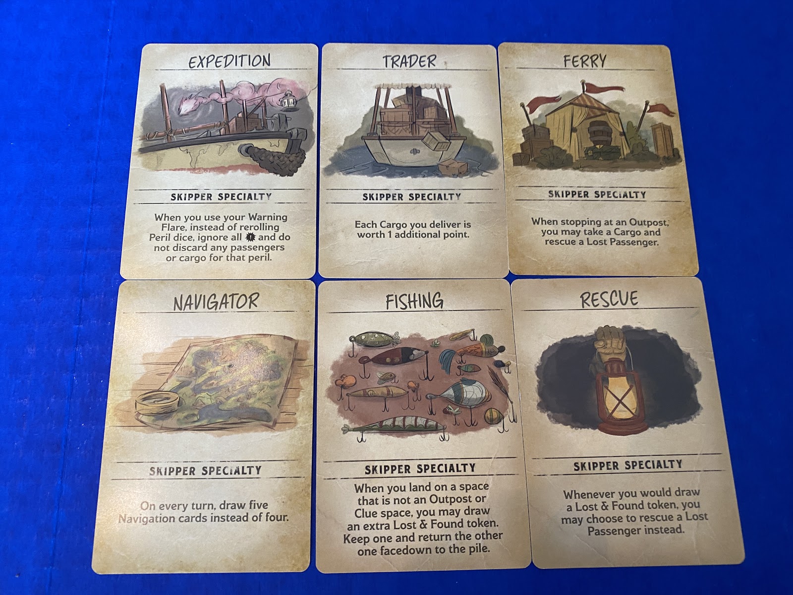 Each player receives a Warning Flare, which they can use for a reroll on a Navigation Card. There are four Outposts on the board where players must stop their turn when they pass. A used Warning Flare can be reactivated at an Outpost and players can also pick up Lost & Found items here, as well as at the start of every turn if they have an opening on their boat. There are three types of Lost & Found items, which become more important by the end of the game when each player’s cargo is evaluated to determine a winner.