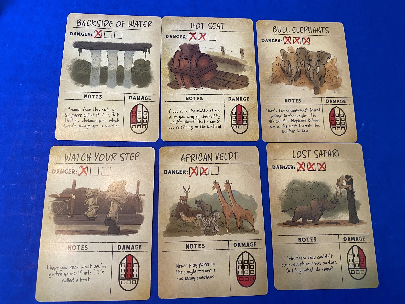 There are two types of cards. The Skipper Specialty Cards look like a pocket of a skipper’s shirt and contains one of six special abilities that assist them on each turn. Each player takes one at the start of the game. The other cards are Navigation Cards, which get shuffled into one desk that players draw from. Every time a player lands on a neutral space, they draw four cards, choosing the ones they want to play based on the number of spaces they moved during that turn (the max is four). These cards are themed to scenes in the attraction and contain jokes on them. There are three dice with “!” marks and players roll the number that corresponds to the danger on the card. The card also notes which section of the boat is being targeted. Players remove one crew or cargo from that section for every “1” they roll.