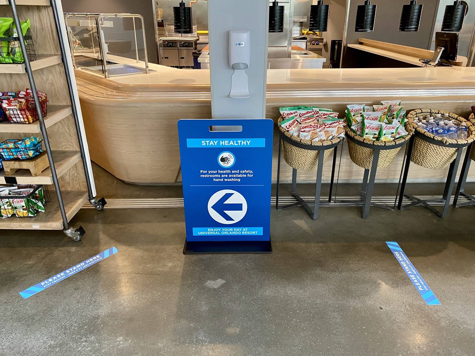 Throughout the hotels, new signage, hand sanitizing stations, and plexiglass partitions have been added.