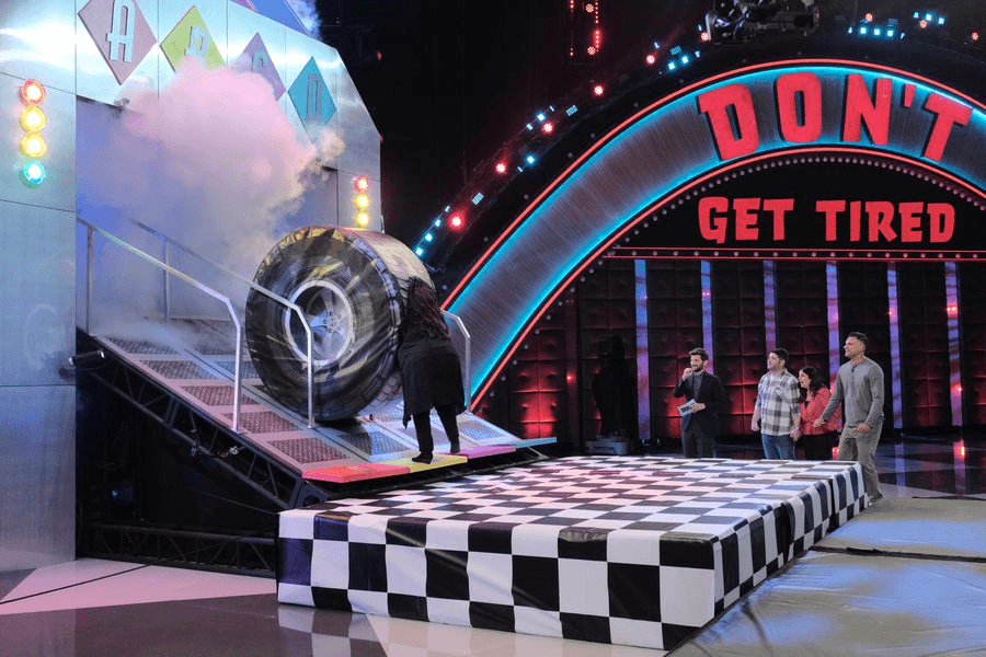 “Don’t Get Tired:” Four ramps are set up with Monster Truck-sized tires at the top of each. The bottom features the letters A-D and the four players take turns being at the bottom of one of the ramps. Where they stand is determined by the answer the other members give to a multiple choice trivia answer. If the answer is correct, the tire will drop from all but the lane of the correct answer. If they’re wrong, the only tire that rolls is the one that they’re standing on. The team earns money for each correct answer, but the penalty for a wrong answer is getting, well, “Tired.”
