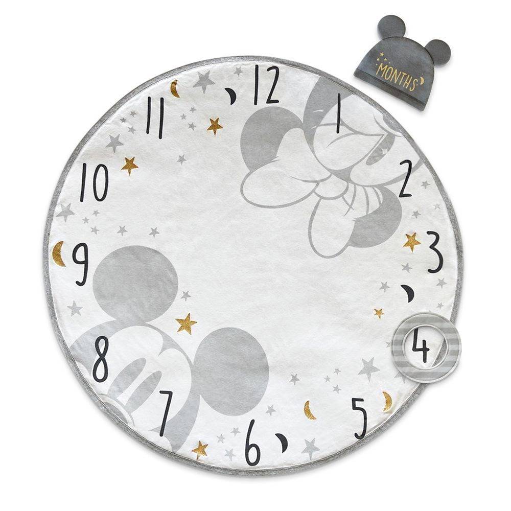 “Mickey and Minnie help make a lasting memory each month of baby's first year with this magical milestone blanket. Two markers note the progressive months of baby's growth for your picture-taking pleasure.”