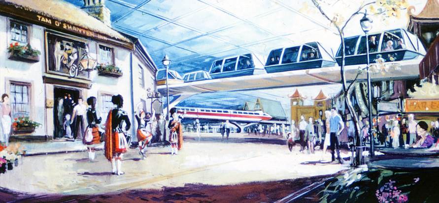 EPCOT as we know it also almost got its own Peoplemover that would run the stretch from Spaceship Earth toward World Showcase while traversing through either side of Communicore/Innoventions. A planned second level concourse that would line the exterior walls past the exhibits never came into fruition.