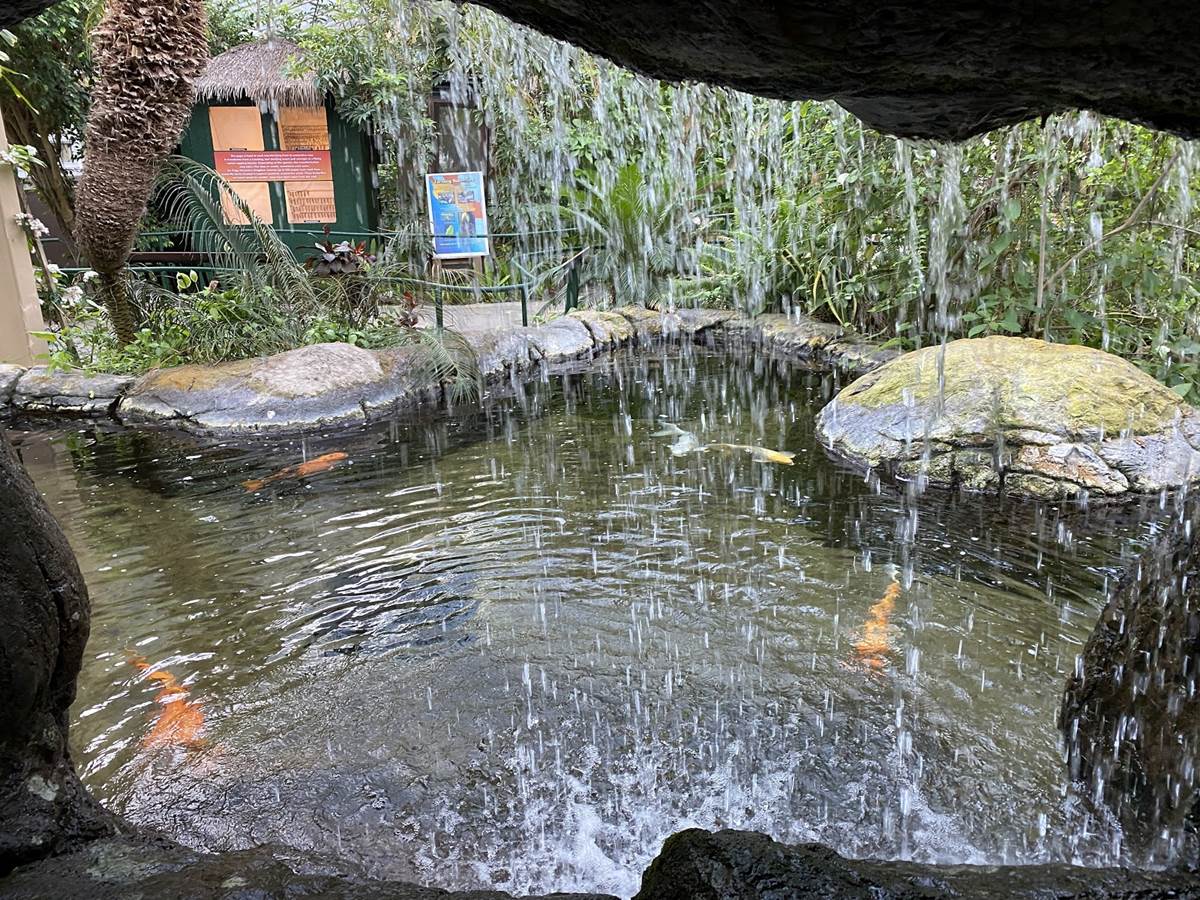 The one indoor animal experience open is a butterfly greenhouse which also includes a koi pond with a waterfall. The Jungle Cruise at Disneyland may be closed, but this offers a nice view of the “Backside of water.”