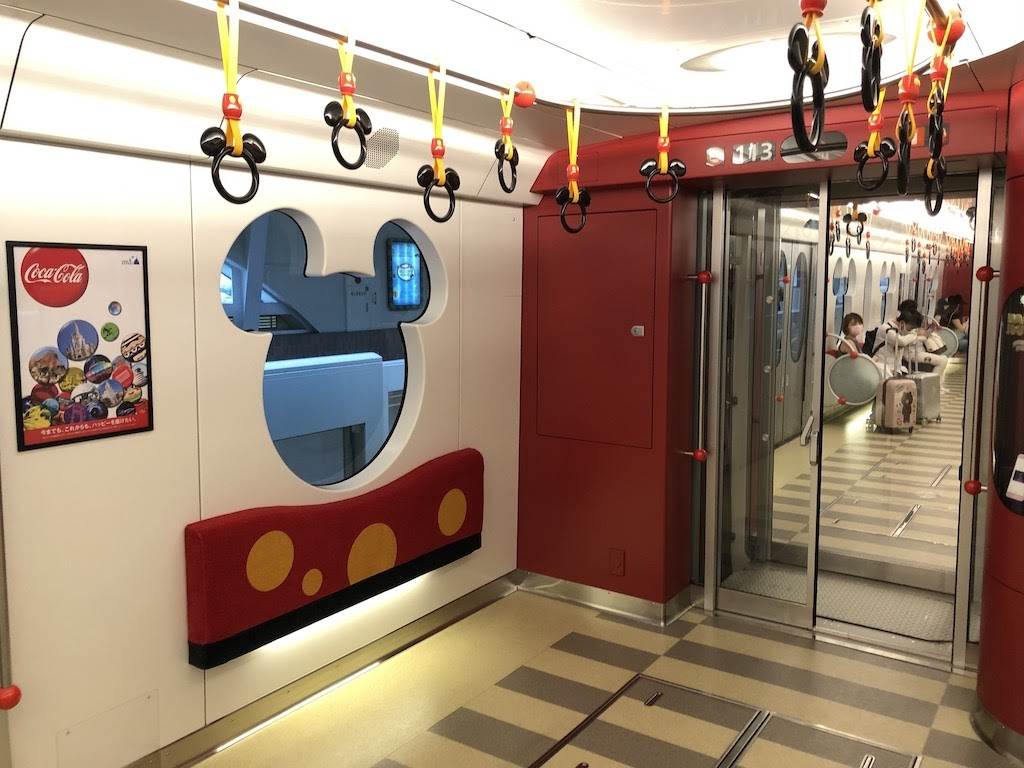 Inside the observation car are individual seats and a bench with a design inspired by Mickey’s iconic look. There are also Mickey Mouse-shaped hand grips for those who want to stand while riding.
