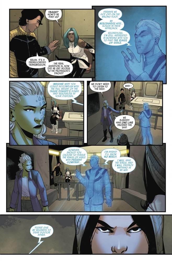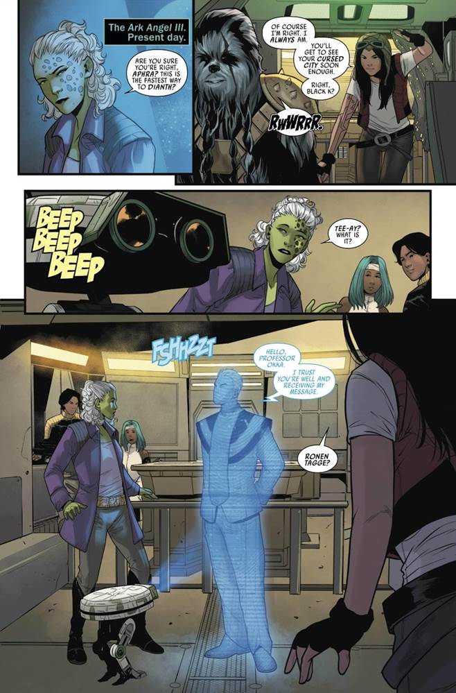 Aphra and her newly assembled team of misfits have been enlisted by a wide-eyed student Detta Yao to track down the legendary Rings of Vaale-- a set of ancient artifacts with supposed mystical powers. Together they travel to the planet of Dianth in search of the Lost City of Vaale and encounter a series of bone-chilling phenomena, all the while being pursued by Aphra’s Belloq stand-in Ronen Tagge, an aristocrat whose bizarre ambition is to be the last person to touch valuable relics before he destroys them. This cast of characters is proving itself to be a winning one, with Wookiee bounty hunter Black Krrsantan, professional assassin Just Lucky, and another of Aphra’s old flames Professor Professor Eustacia Okka all happily along for the ride.
