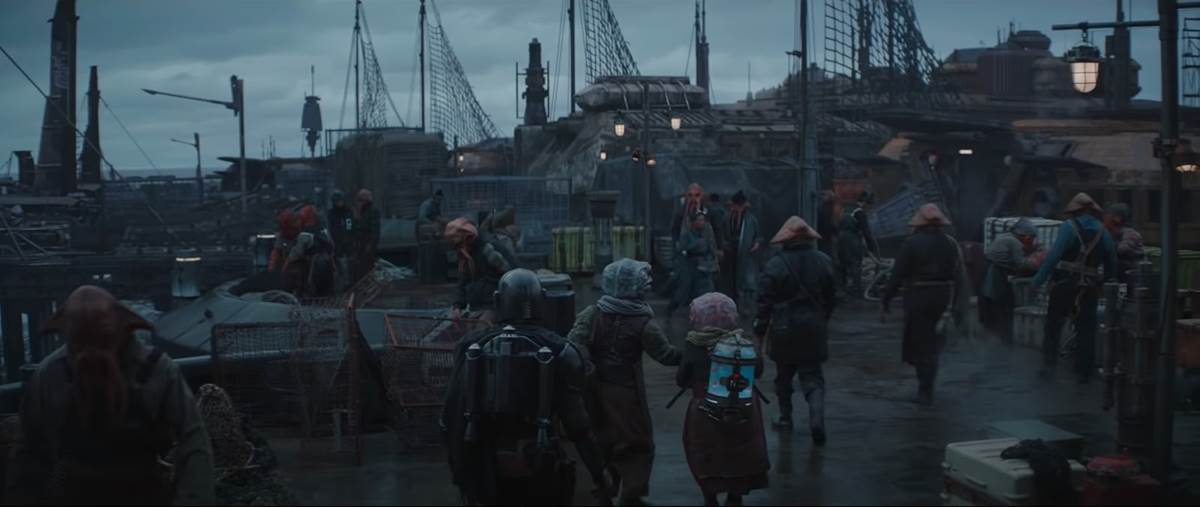 SHOT 9: Now this is exciting. Mando makes his way through a bustling dockside seaport on what we can probably assume is the aquatic planet Mon Cala, homeworld to the Mon Calamari and Quarren (as you can see a number of both species working the docks). There are also a few scattered humans and two other aliens of a different race. Plus, our protagonist is wearing his jetpack! Exciting.