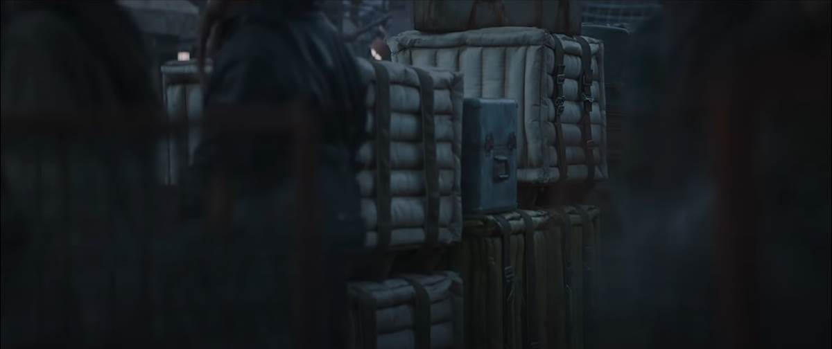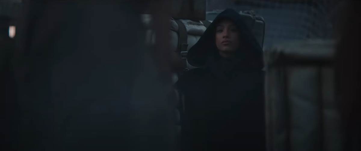 SHOT 10: A cloaked figure watches from among a stack of crates on the docks as passersby cross in front of the camera. This is the character played by professional wrestler Sasha Banks, and who exactly that character is has been the subject of much speculation in the fan community-- the leading theory being that Banks may be portraying Sabine Wren from the animated series Star Wars Rebels. Obviously this has not been confirmed.