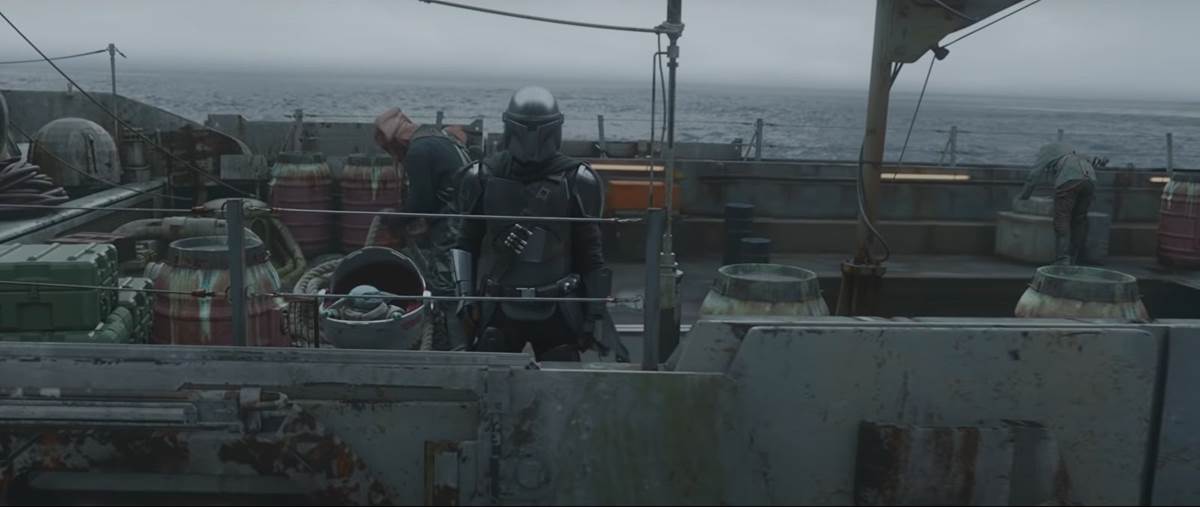 SHOT 16: We see that Djarin and the Child are passengers on some sort of cargo ship. There are barrels scattered around the deck and we see two Quarren working with ropes and moving crates.