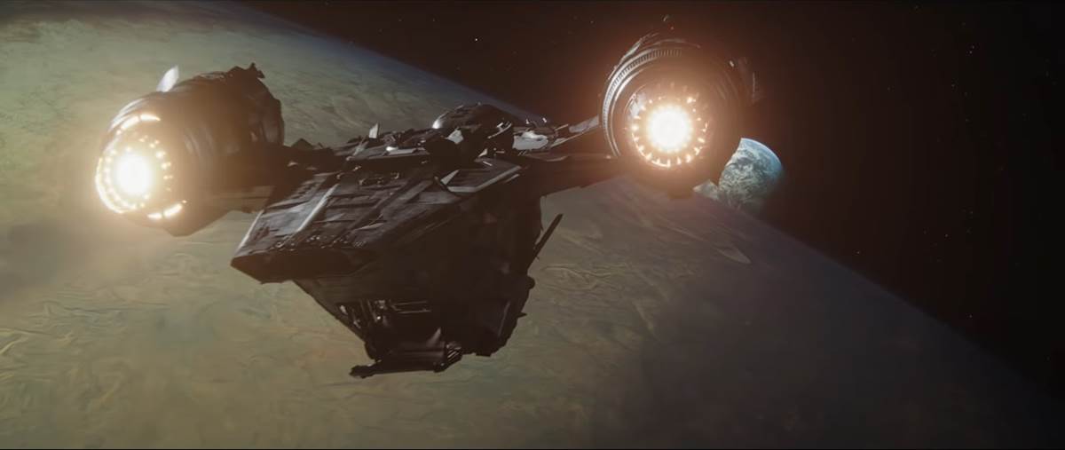 SHOT 1A: The Razor Crest (bounty hunter Din Djarin’s ship AKA the series’ title character) limps into view, and it has definitely seen better days. The ship appears as though it has been attacked and/or mercilessly disabled in a space battle. One of its engines flickers on and off as sparks fly and the rear cargo bay door hangs limply open. The ship slowly drifts its way toward the distant planet.