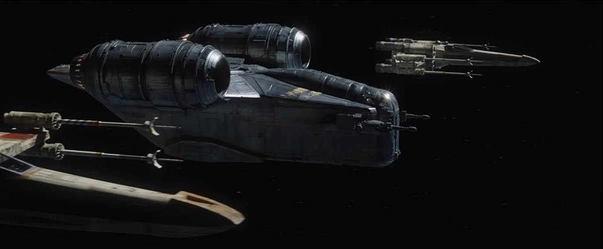 SHOT 18: The Razor Crest (notably in much better shape here) is flying through space, either being escorted or surrounded by two New Republic X-Wing starfighters.