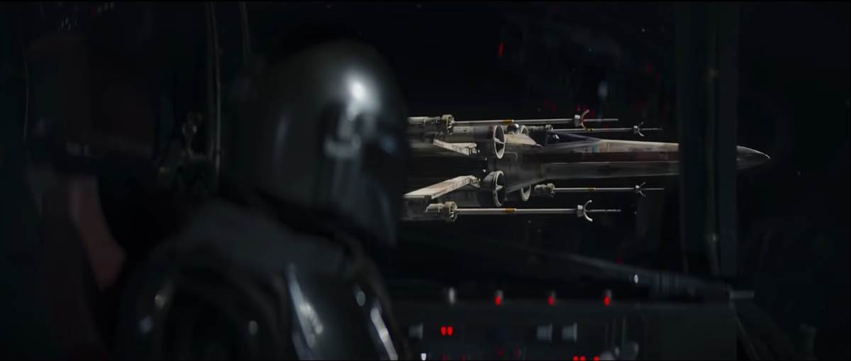 SHOT 19: Mando watches from the Razor Crest’s cockpit as the X-Wing to his left opens its S-foil wings into attack position.