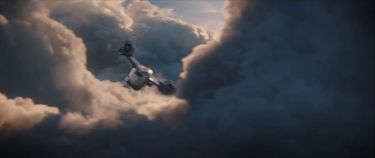 SHOT 20: Now the Razor Crest races through clouds in-atmosphere, apparently being pursued by the two X-Wings. Or is it leading an attack?