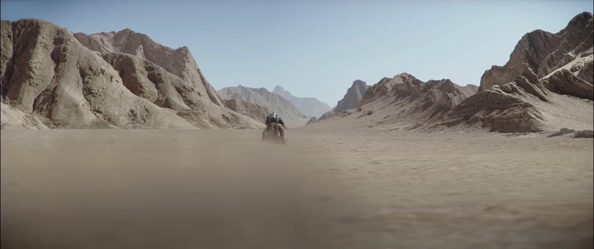 SHOT 21: The Mandalorian (jetpack on) rides away from the camera on a speeder bike or swoop through what is again probably the Tatooine desert, with mountains surrounding him.