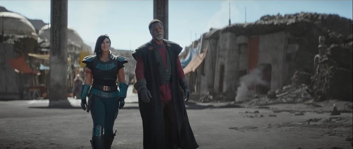 SHOT 22: Cara Dune (Gina Carano) and Greef Carga (Carl Weathers) walk toward the camera, happy to see whoever they are greeting (likely Mando). We are back on Nevarro, the planet featured most heavily in the first season. These two characters’ costumes appear shiny and new, as the marketplace bustles behind them.