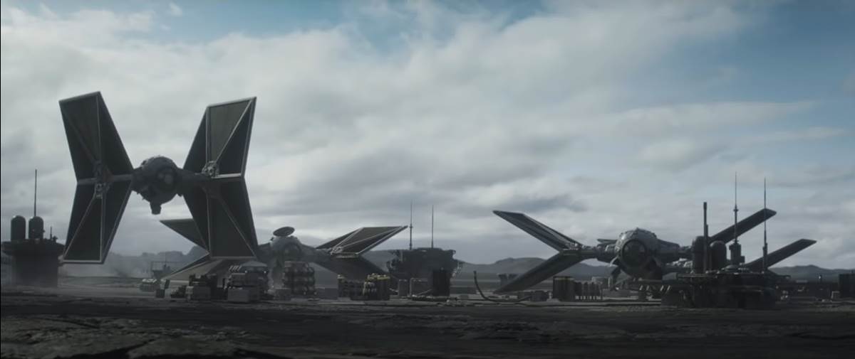 SHOT 23: Four Outland TIE Fighters begin to take off after being parked on the surface of an unknown planet, though it could be Nevarro again. There are crates stacked around the airfield and what appear to be antennae or moisture vaporators dotting the landscape, with mountains in the distant background.