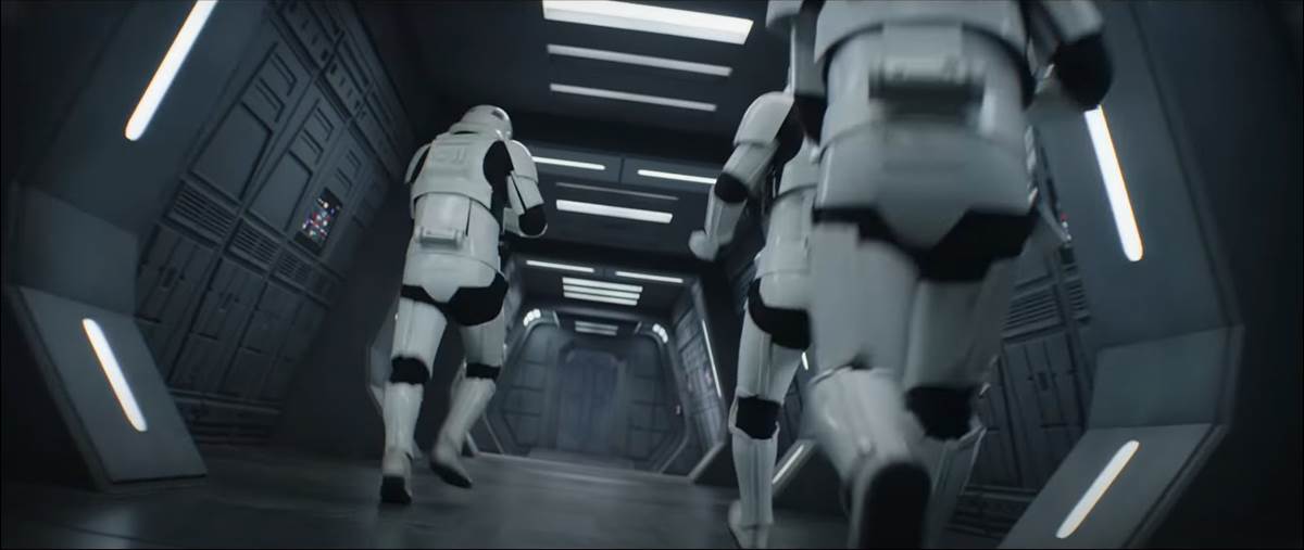 SHOT 24: Three stormtroopers hustle through an Imperial corridor as a klaxon blares and the camera follows behind them. This shot looks like something out of the original Star Wars trilogy, which is great.