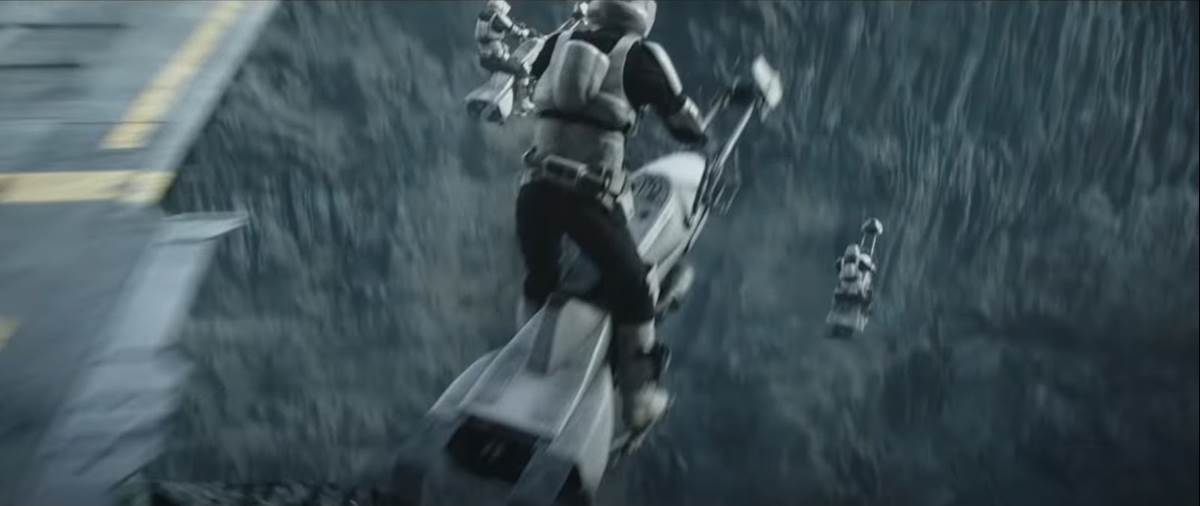 SHOT 25: Three Imperial Scout Troopers on speeder bikes zoom off a platform into a rocky canyon below. This looks dangerous!