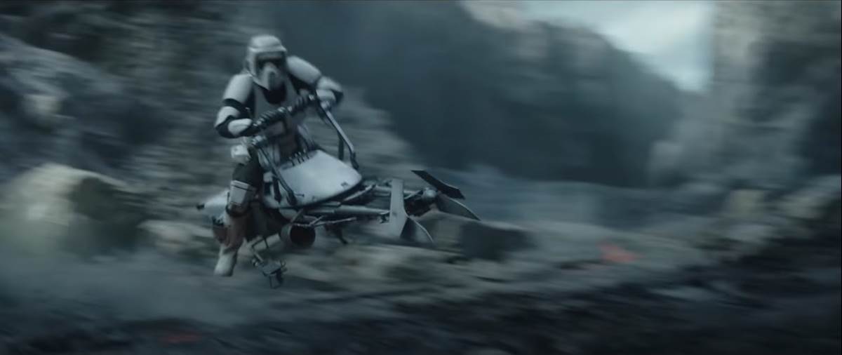 SHOT 26: One of the speeder bikes lands on the canyon floor, Scout Trooper still mounted safely aboard. He skids and turns the bike toward the camera.