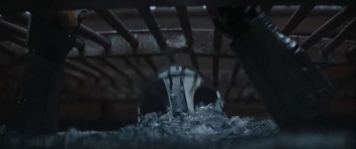 SHOT 27: Mando emerges from water and grabs a grating above him.
