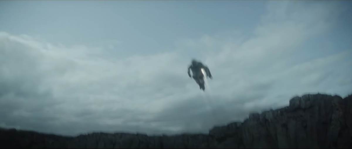 SHOT 28: Mando jumps off a similar-looking canyon edge and ignites his jetpack.