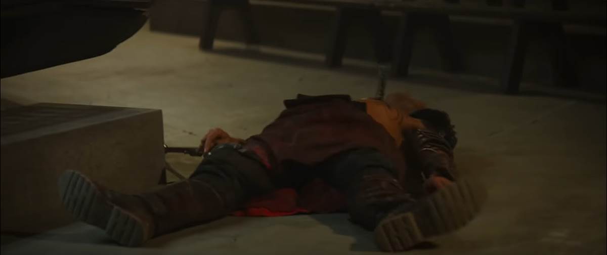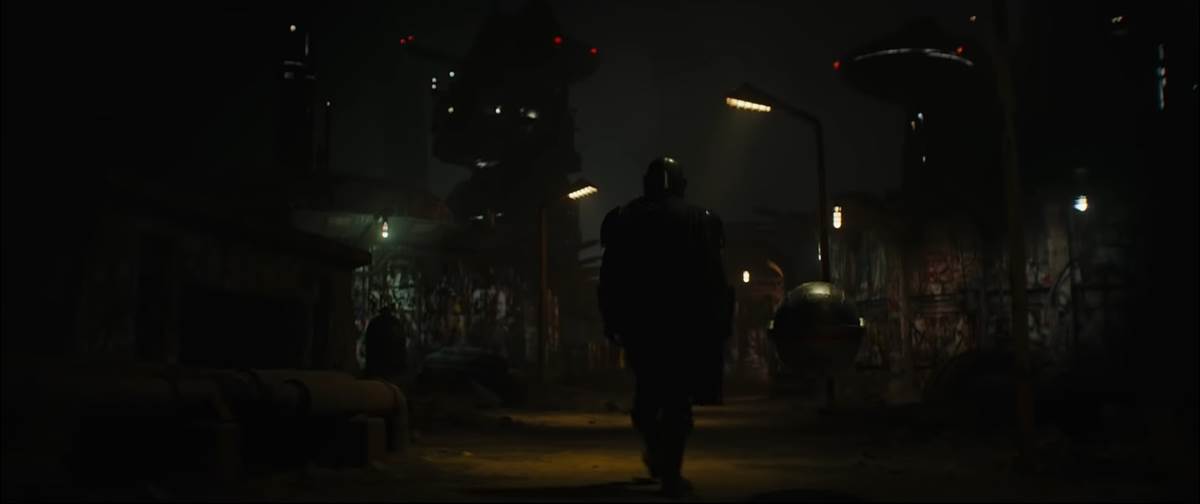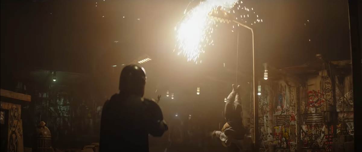 SHOT 30: Back in the underworld city, Mando shoots one of the street lights, which happens to have a person hanging upside-down from it by his or her feet. Sparks erupt in the dark as the light goes out. Did Mando put this person there or is he rescuing them?