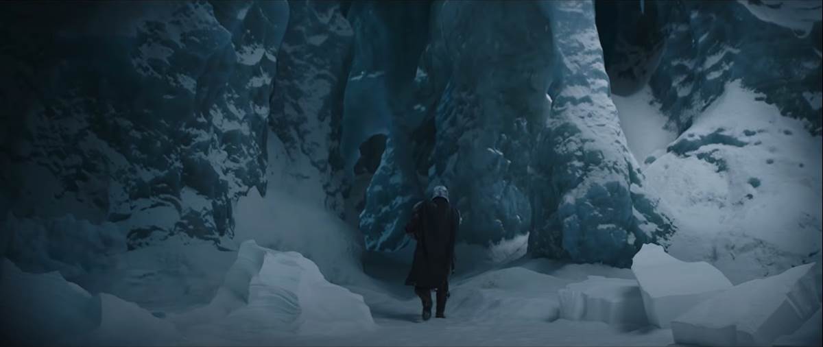 SHOT 31: Back on the snowy planet, we watch from behind as Mando is carrying something into an ice cave. This reminds me an awful lot of the kyber-crystal-rich planet of Ilum from the Star Wars: The Clone Wars animated series and the Star Wars: Jedi - Fallen Order video game. Ilum is also notably the planet that became the First Order’s Starkiller Base in Star Wars: The Force Awakens, so it would be pretty interesting to see it show up in The Mandalorian.