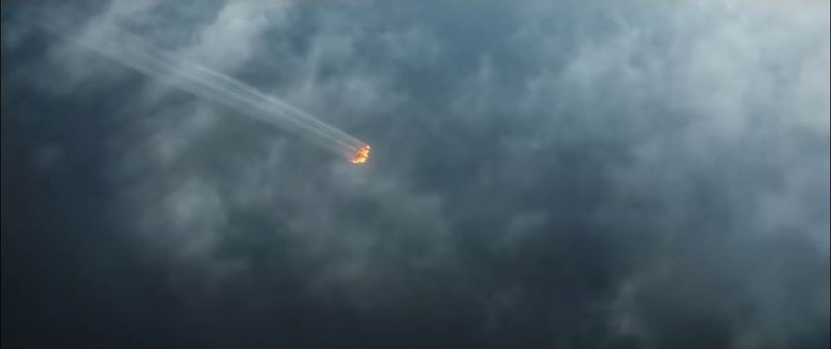 SHOT 34: A much wider shot of the Razor Crest falling through the cloudy atmosphere, still on fire.